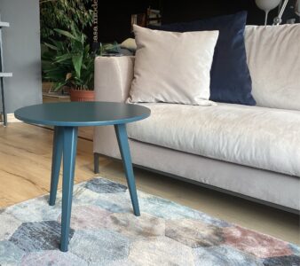 Il tavolino Trio è un comodo appoggio accanto al divano oppure, se viene collocato vicino al letto, un pratico comodino. Il piano è circolare sorretto da tre gambe, in questa versione proposto laccato opaco Laguna. Dimensioni cm 47x43h