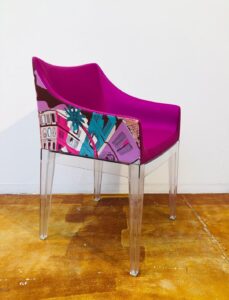 Poltroncina Madame Kartell di design, edizione World of Emilio Pucci, imbottita, con gambe in policarbonato trasparente L. cm 54 P. cm 53 H. seduta cm 47 Il prezzo è da intendersi comprensivo di IVA ed escluso di trasporto e montaggio.