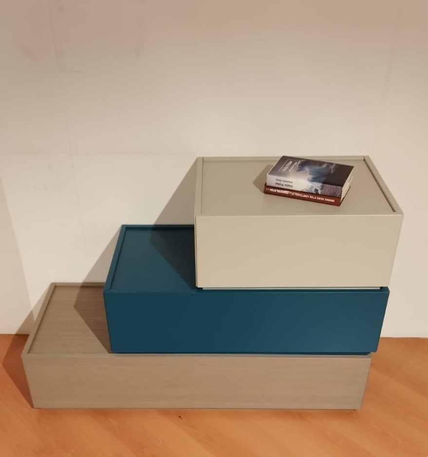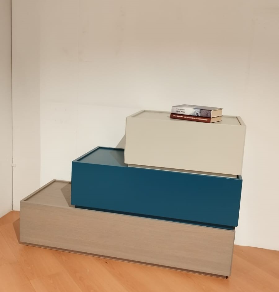 Comò dal design molto originale, composto da 3 elementi combinati l’uno con l’altro che creano sovrapposizioni di volumi e giochi di colore a contrasto.