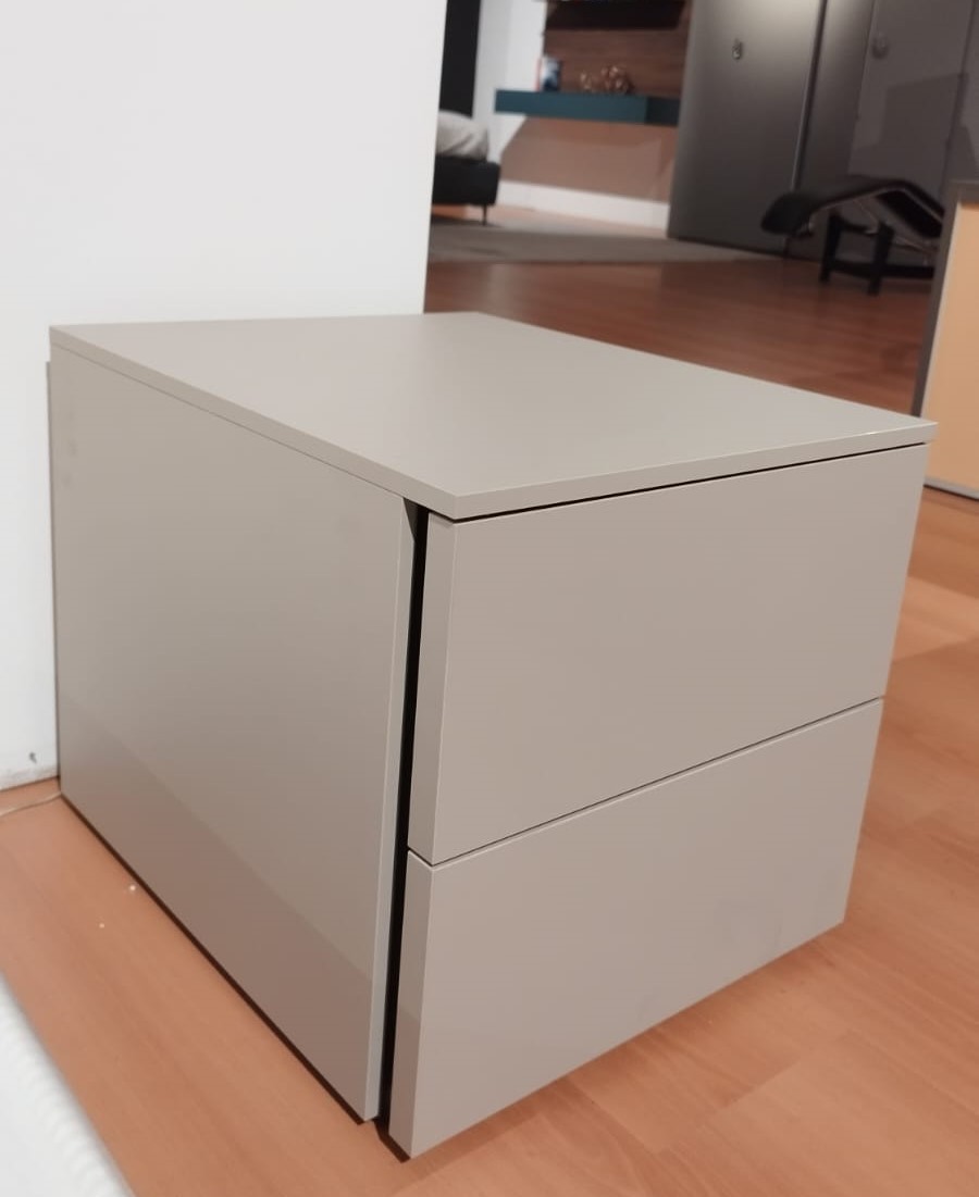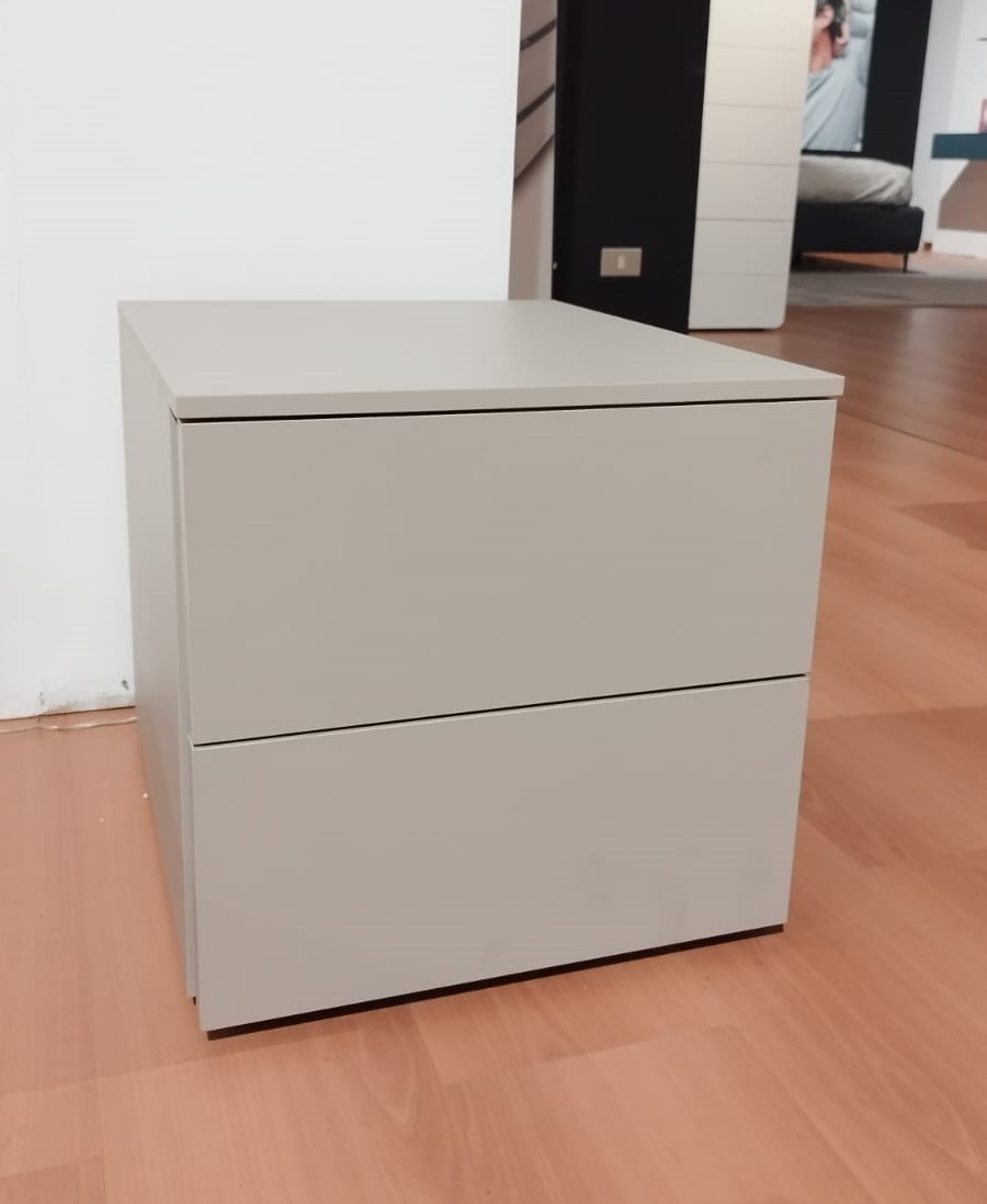 Comodino 2 cassetti, dal design molto semplice e minimale. L’apertura è caratterizzata da una feritoia sul lato del cassetto.