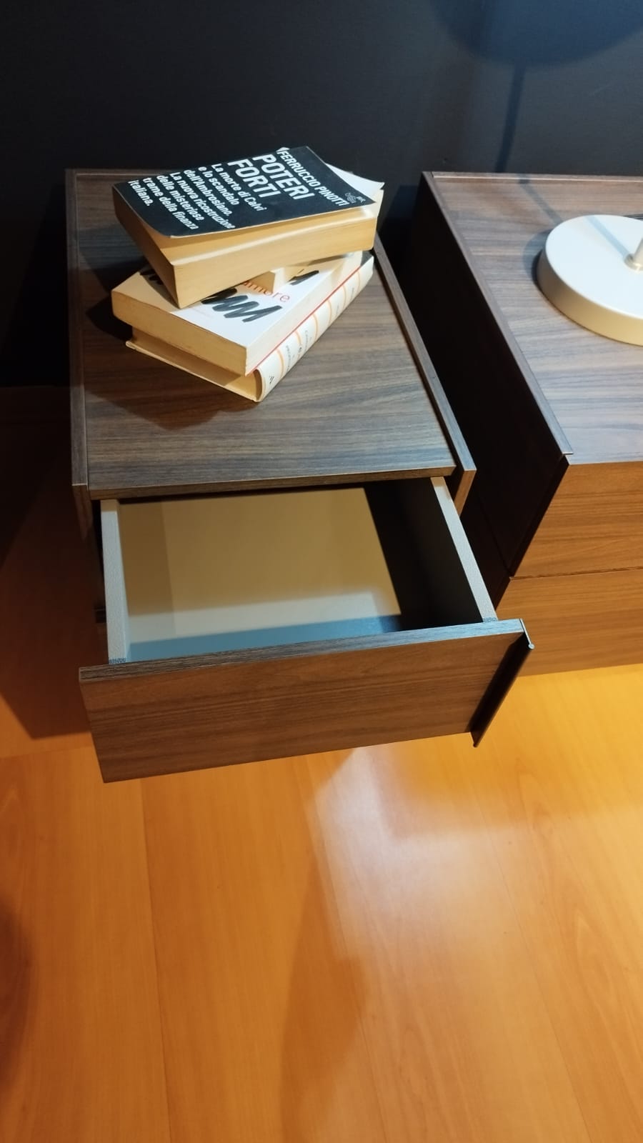 Comodino a terra in finitura Noce con una piccola maniglia verticale in metallo brunito
