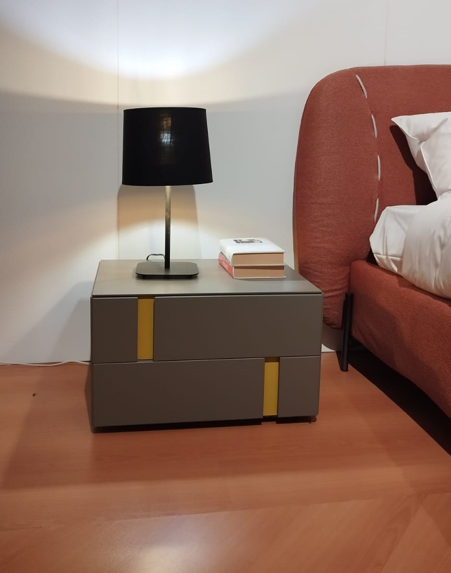 Comodino 2 cassetti La Casa Moderna Modula Night mod. Skat. L’apertura a gola asimmetrica e laccata a contrasto lo rende molto originale e fresco.