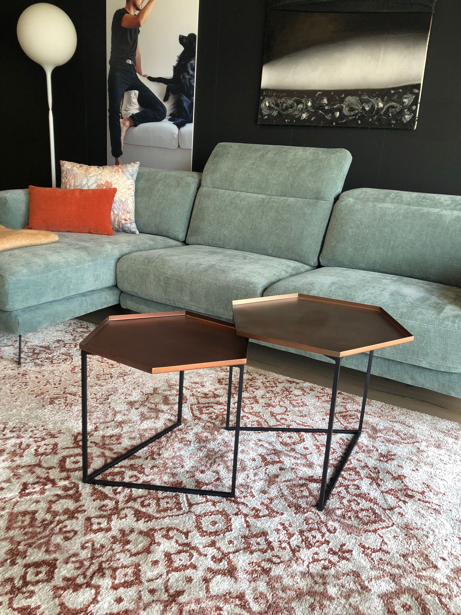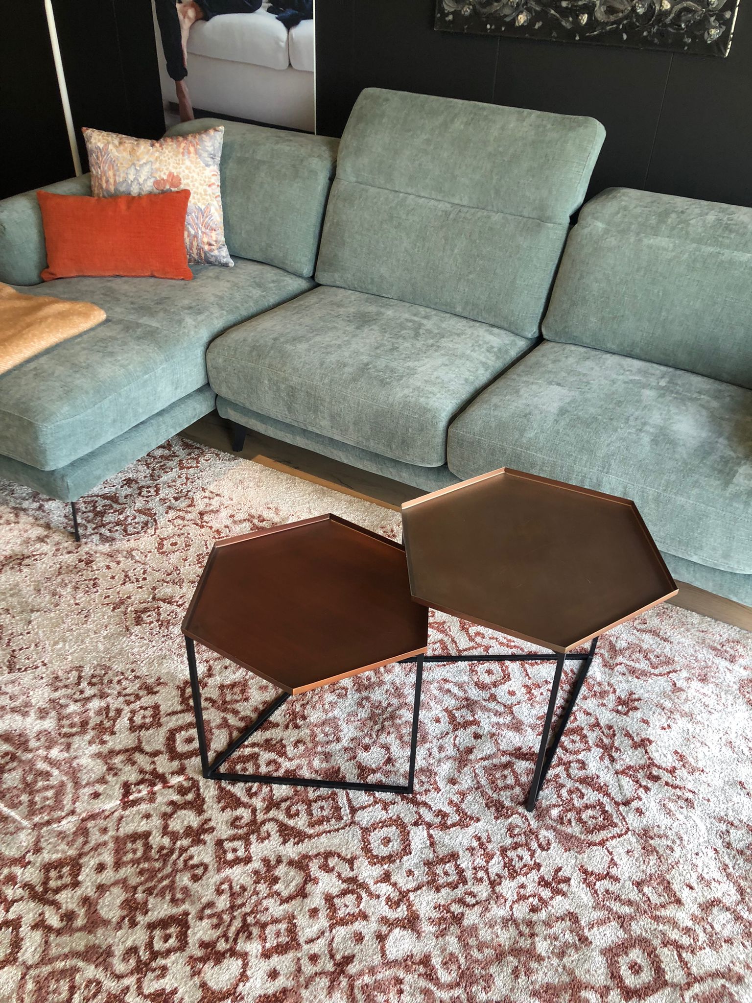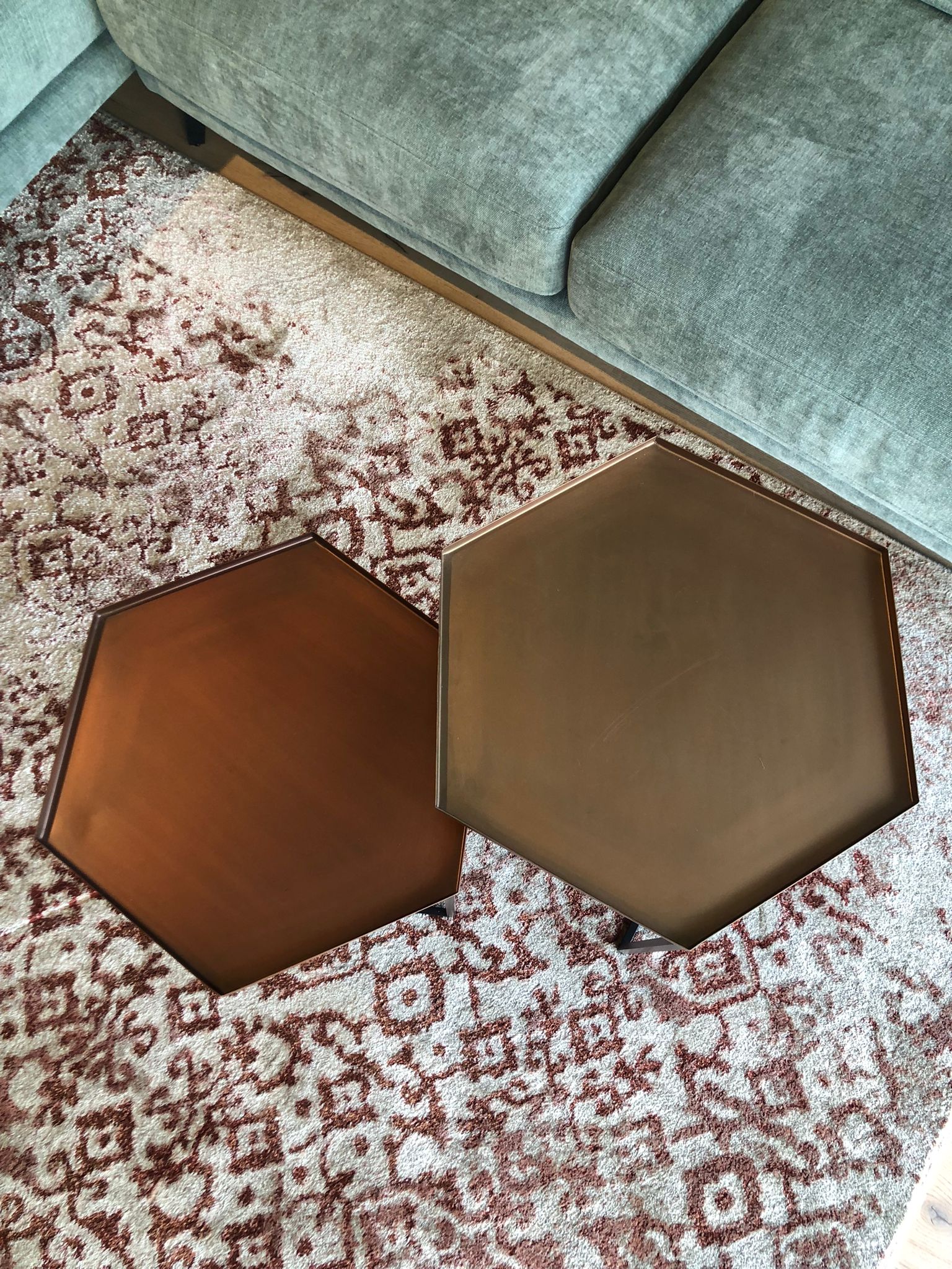 Coppia di tavolini di due diverse altezze, quello più alto color bronzo e quello più basso color rame.
