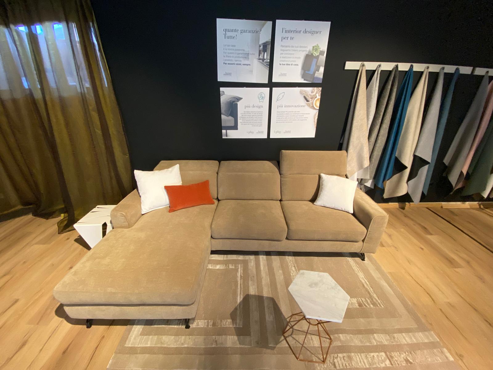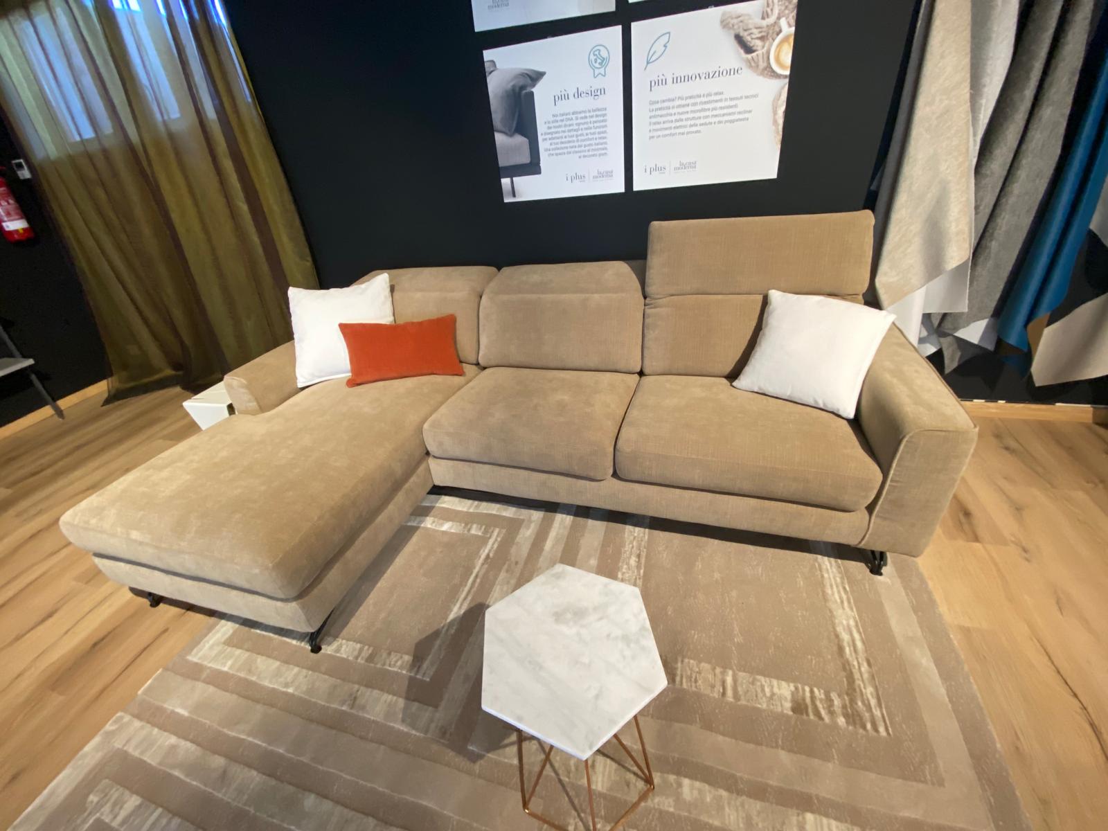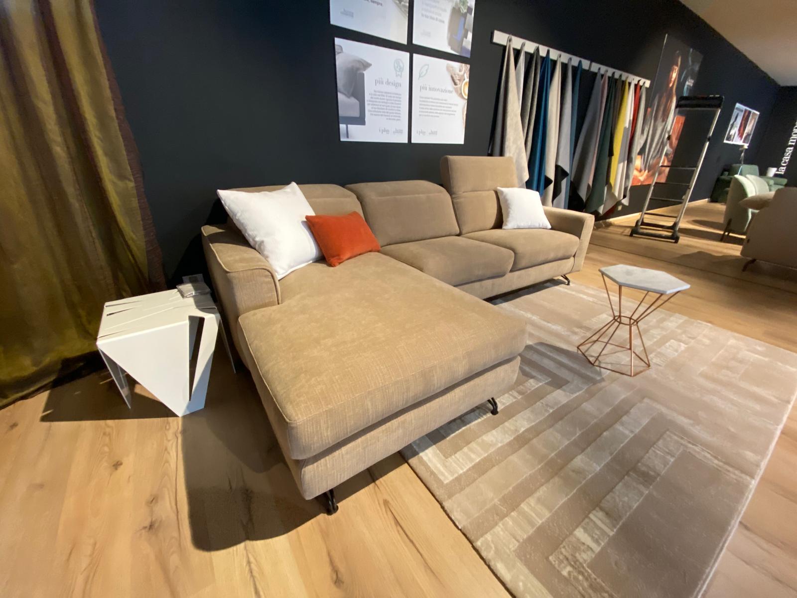 Divano su piedini con chaise longue e poggiatesta con recliner manuale per il massimo del comfort. Rivestito in tessuto 100% poliestere a trama larga idrorepellente, smacchiabile e irrestringibile colore beige. Piedino marrone moka