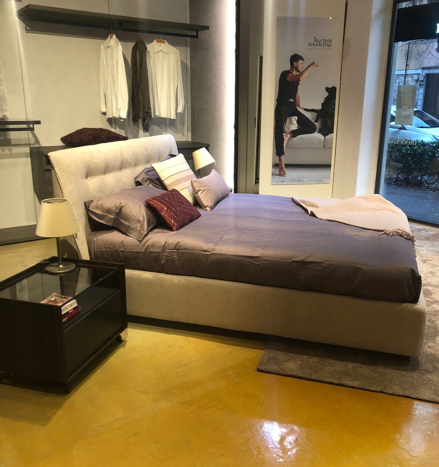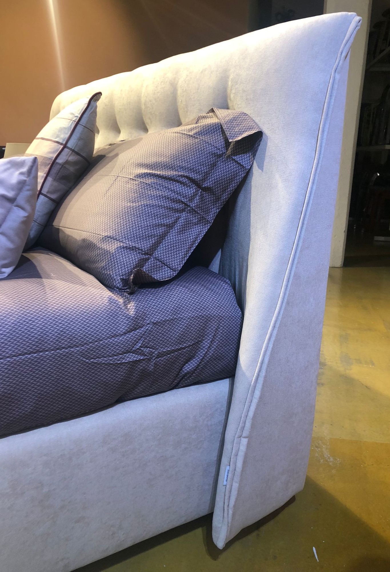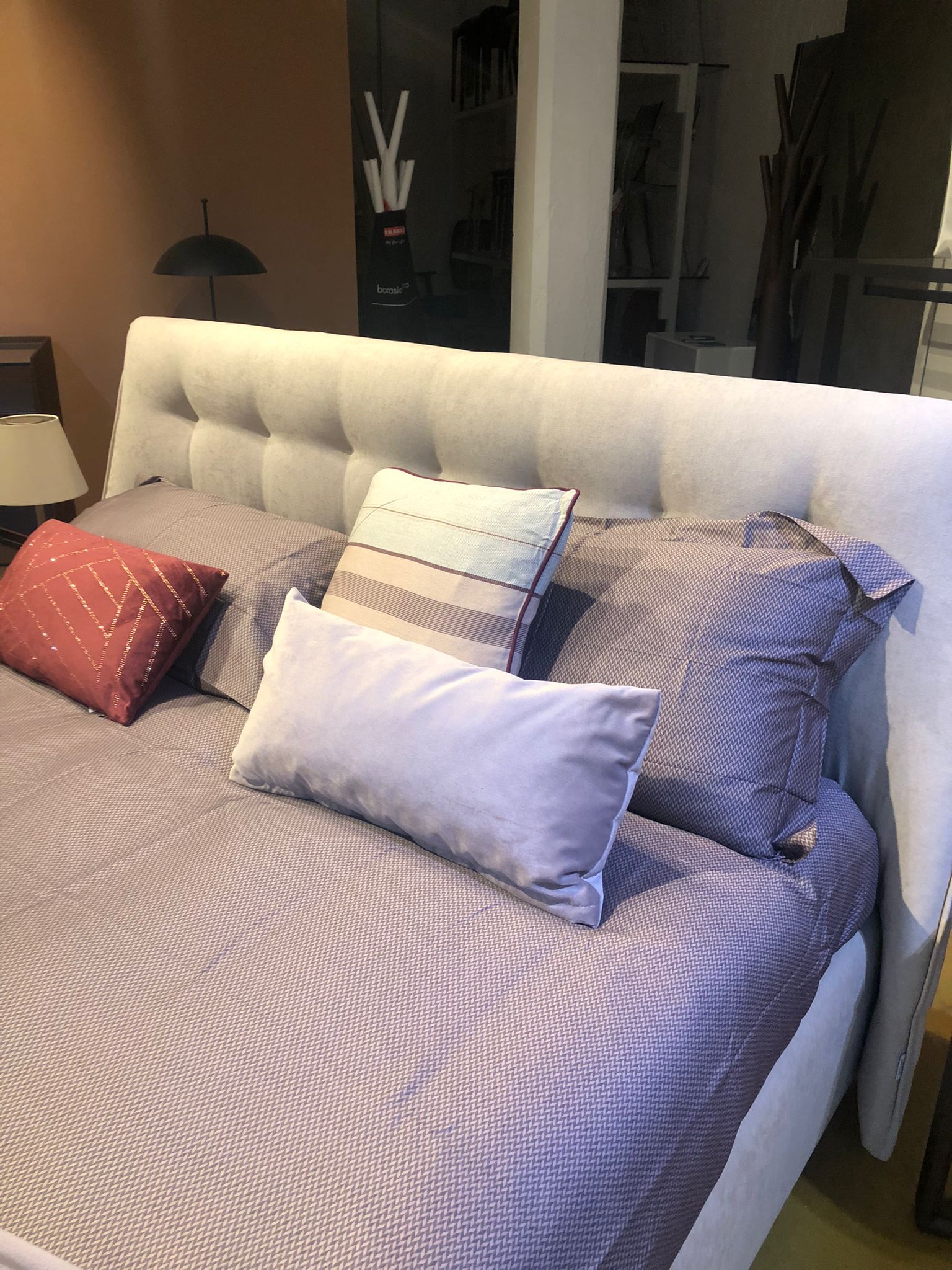 Questo letto dallo stile romantico è caratterizzato da una testata capitonnè che abbraccia il giroletto contenitore.