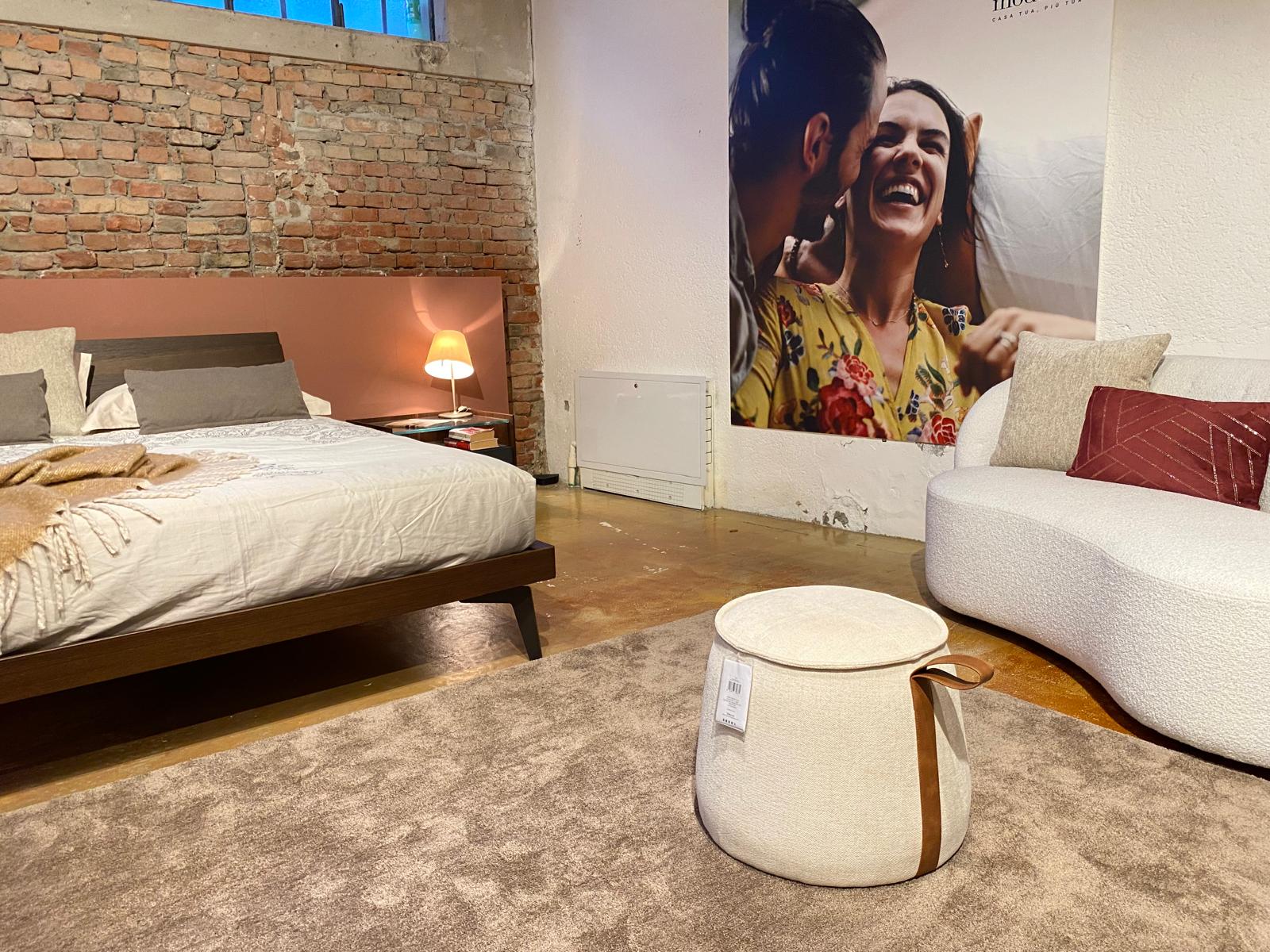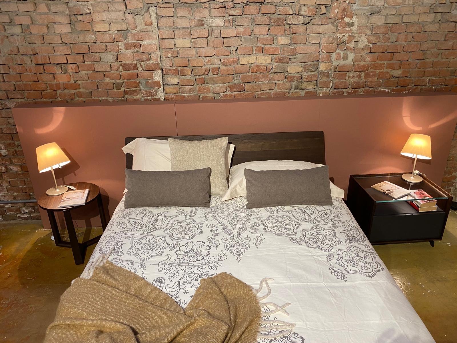 Letto in impiallacciato legno Rovere Termotrattato con rete cm 160×200. La testiera, che si rastrema progressivamente verso l’alto, è giunta al giroletto con un inclinazione di 45*. Il piede sagomato a “X”è in metallo Brown.