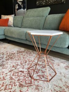 Tavolino dalla forma esagonale con una struttura in metallo rame e un piano effetto marmo venato bianco. Dimensioni cm 37x37x47h Il prezzo è da intendersi comprensivo di IVA ed escluso di trasporto e montaggio.