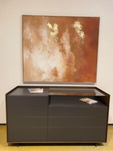 Comodino su piedini H13 in metallo brunito come la piccola maniglia verticale dei cassetti. La sovrapposizione di moduli di diverse dimensioni crea un effetto molto originale. Dimensioni: cm 68x51x54h Il prezzo è da intendersi comprensivo di IVA ed escluso di trasporto e montaggio.
