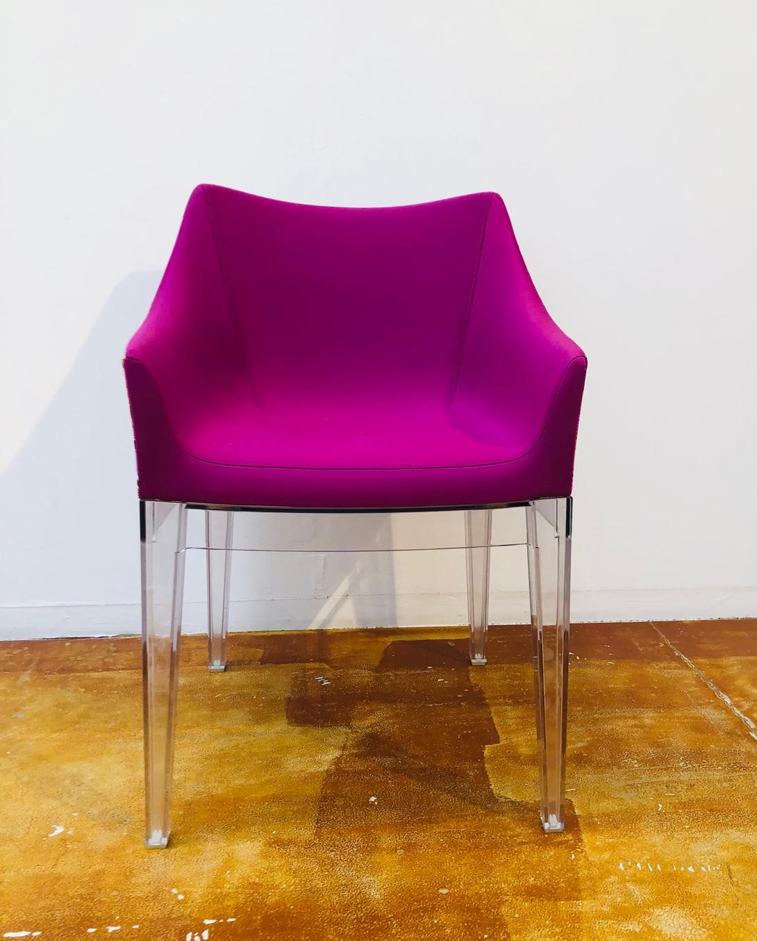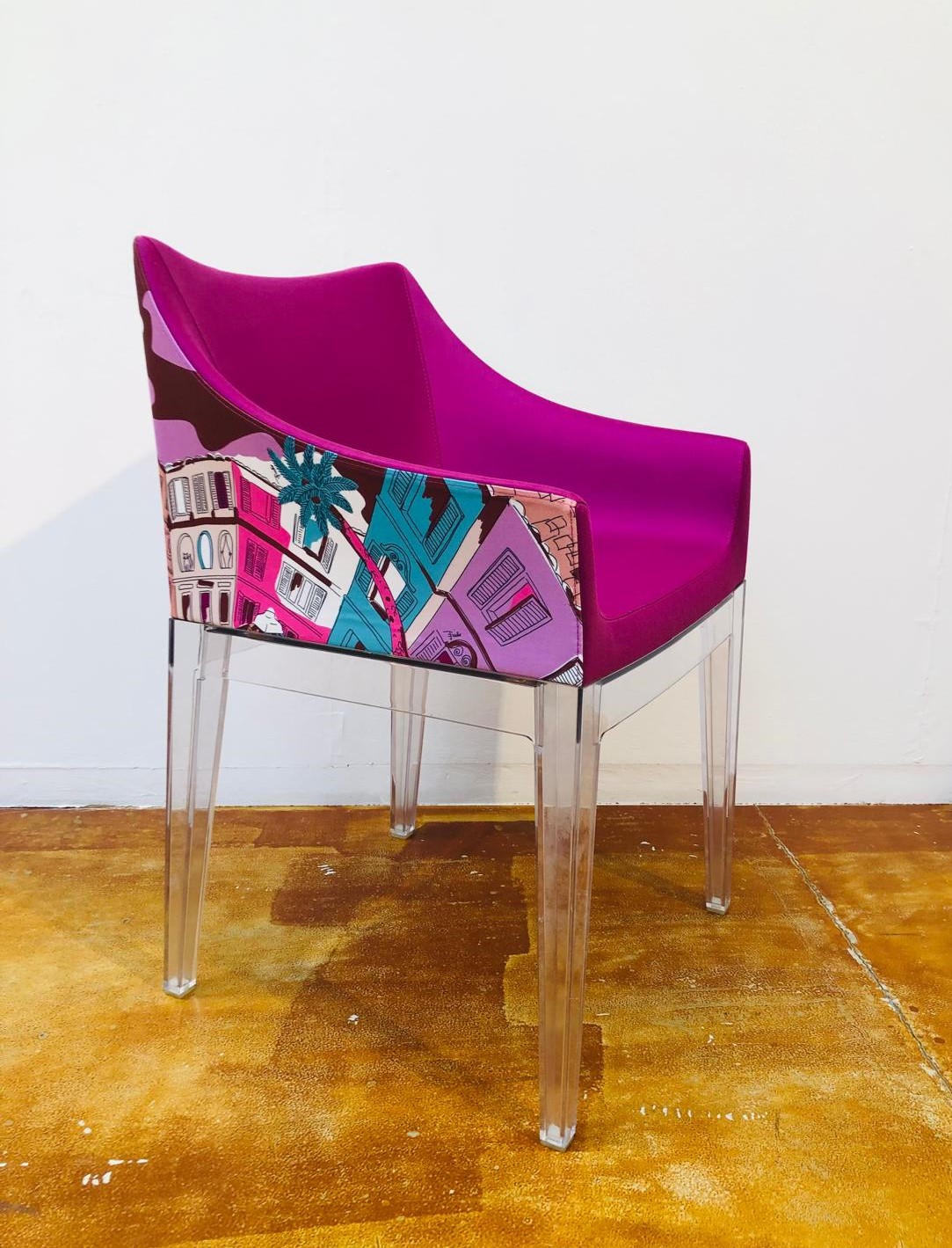 Poltroncina Madame Kartell di design, edizione World of Emilio Pucci, imbottita, con gambe in policarbonato trasparente
