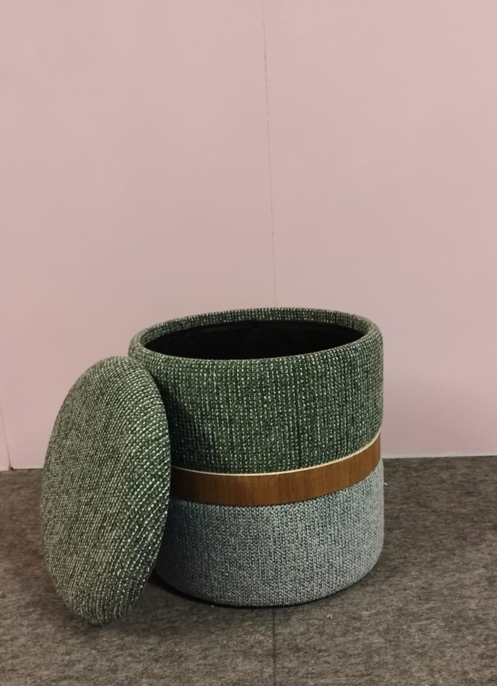 Pouff contenitore con fascia decorativa in legno di frassino, disponibile in due dimensioni