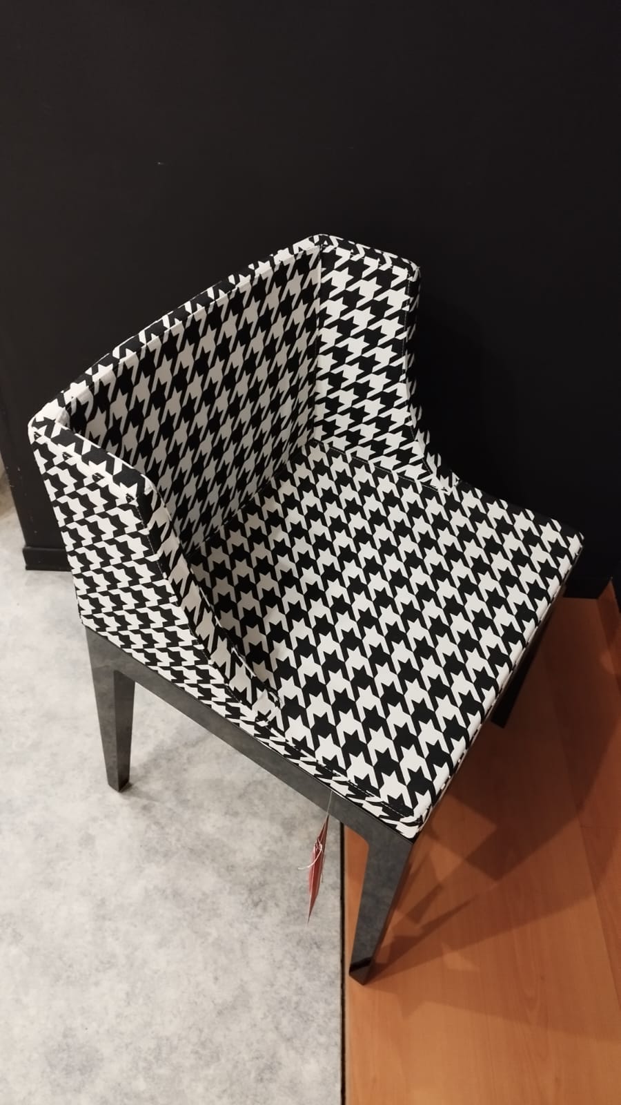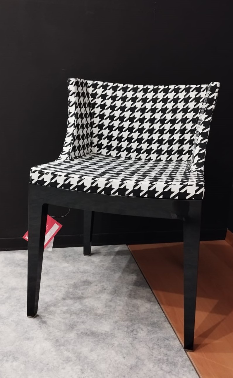 Mademoiselle è una poltroncina di Kartell con la struttura in policarbonato nero e rivestita in tessuto pied de poule