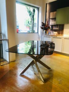 Tavolo in vetro bronzo MyDeko mod. George con angoli raggiati e basamento in metallo oro. Dimensioni cm 160x90x75h Il prezzo è da intendersi comprensivo di IVA ed escluso di trasporto e montaggio.