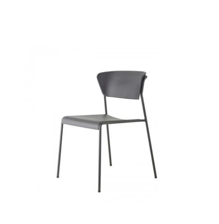 Lisa è una sedia di Scab caratterizzata da forme soft e un sottile telaio tubolare che contorna e sostiene seduta e schienale in tecnopolimero antracite