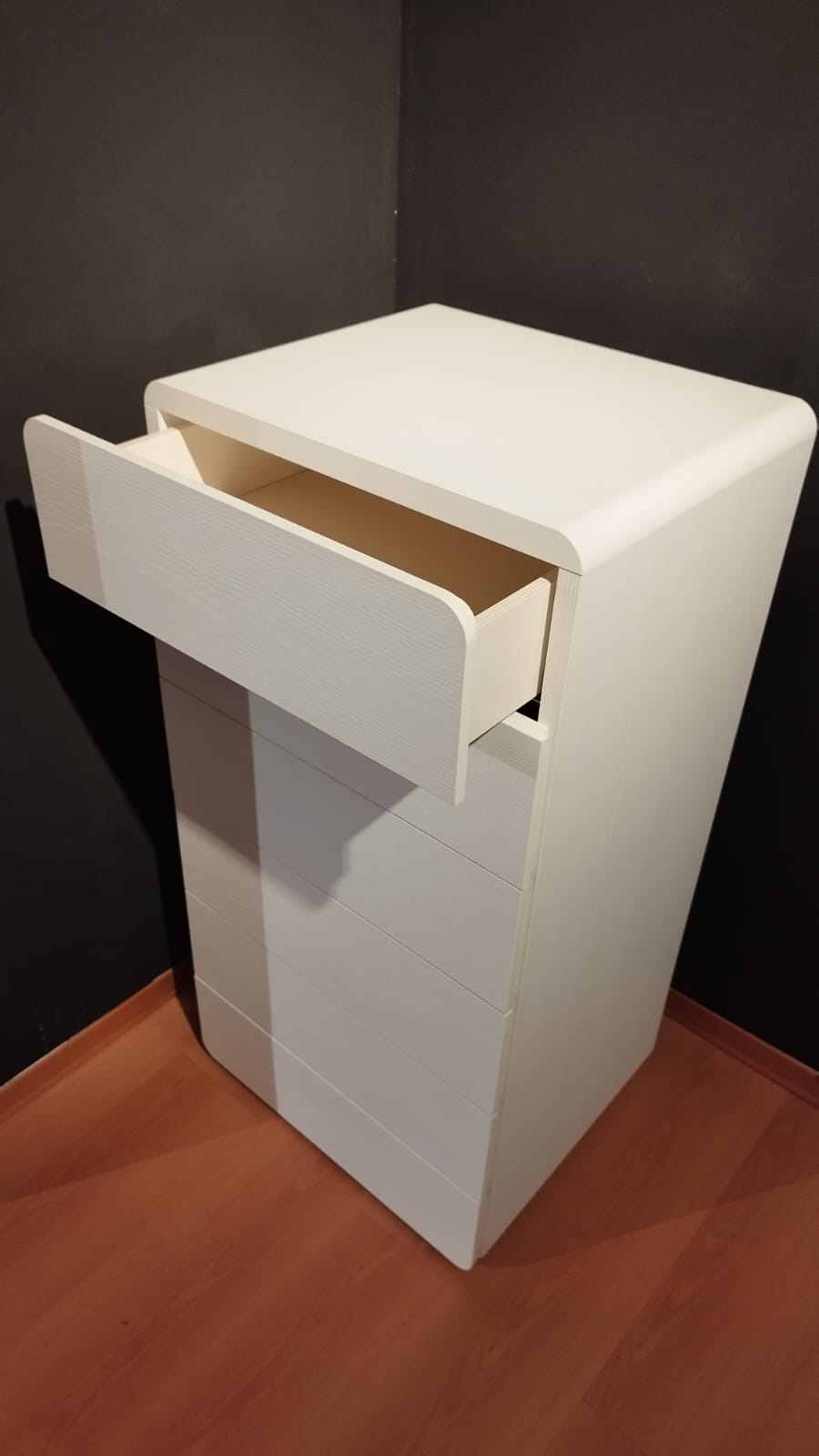 Settimanale a 6 cassetti in frassinato bianco caratterizzato dai frontali dei cassetti con gli spigoli arrotondati.