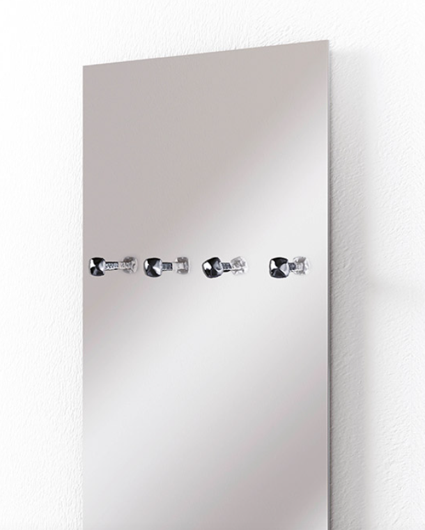 Specchio a parete con quattro appendiabiti integrati a forma di vite, cromati.