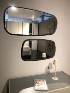Specchio dalla forma irregolare con struttura portante in legno, bordo nero finito con bisellatura. Dimensioni cm 68x140 Il prezzo è da intendersi comprensivo di IVA ed escluso di trasporto e montaggio.