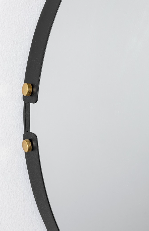 Specchio da parete rotondo con cornice nera che presenta la particolarità di essere interrotta e impreziosita da due dettagli color oro.