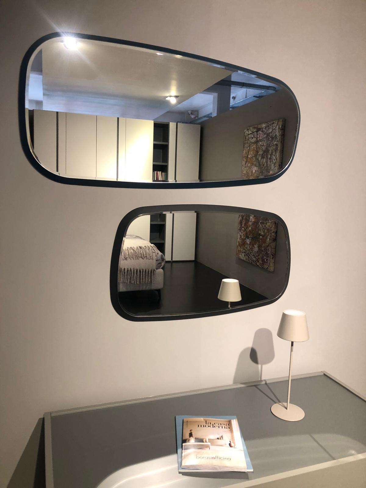 Specchio dalla forma irregolare con struttura portante in legno, bordo Blu Prussia finito con bisellatura.