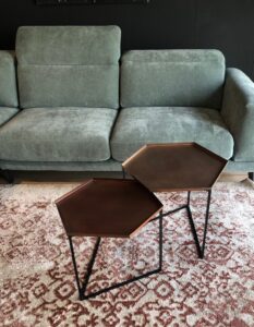 Coppia di tavolini di due diverse altezze, quello più alto color bronzo e quello più basso color rame. Dimensioni cm grande 58x47,5h - piccolo 50,5x42,5 Il prezzo è da intendersi comprensivo di IVA ed escluso di trasporto e montaggio.