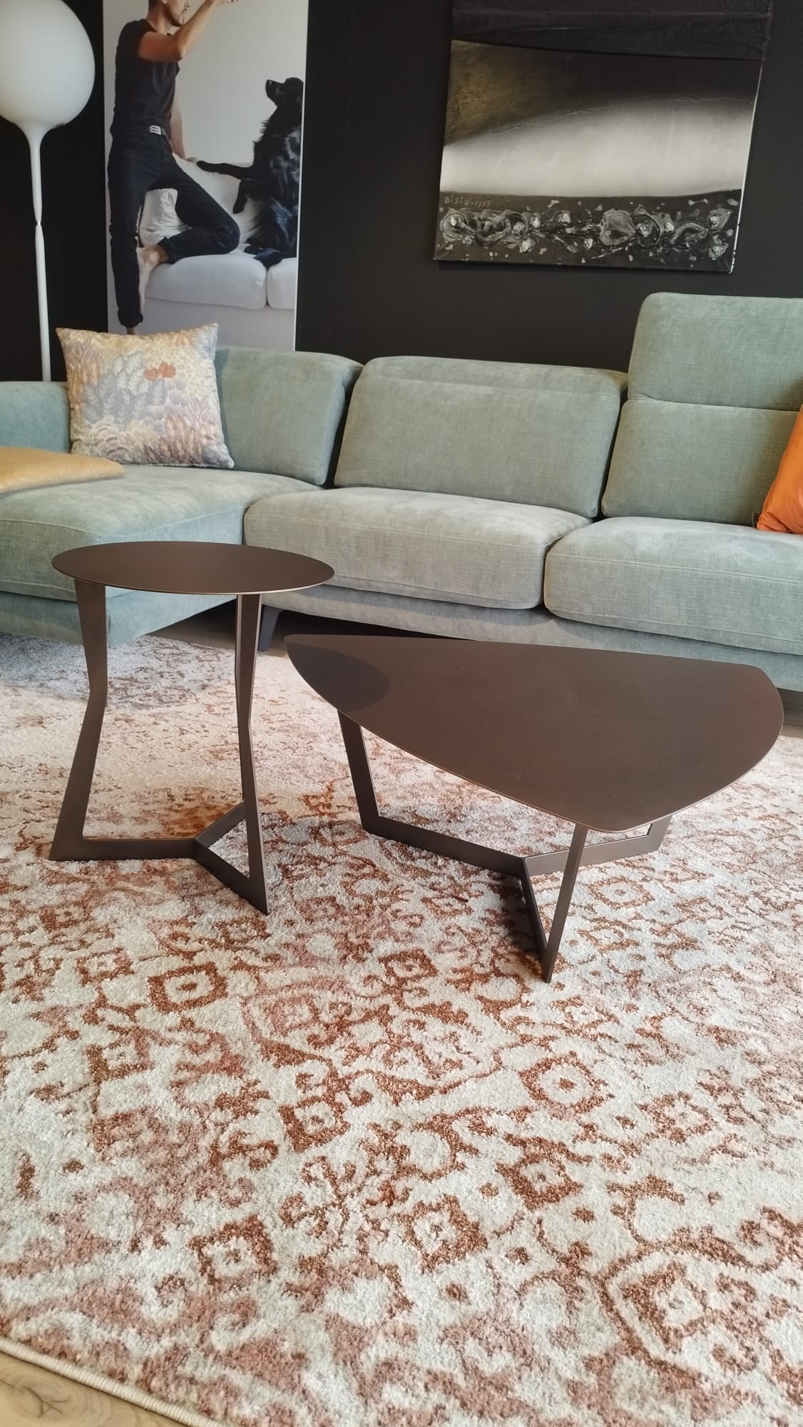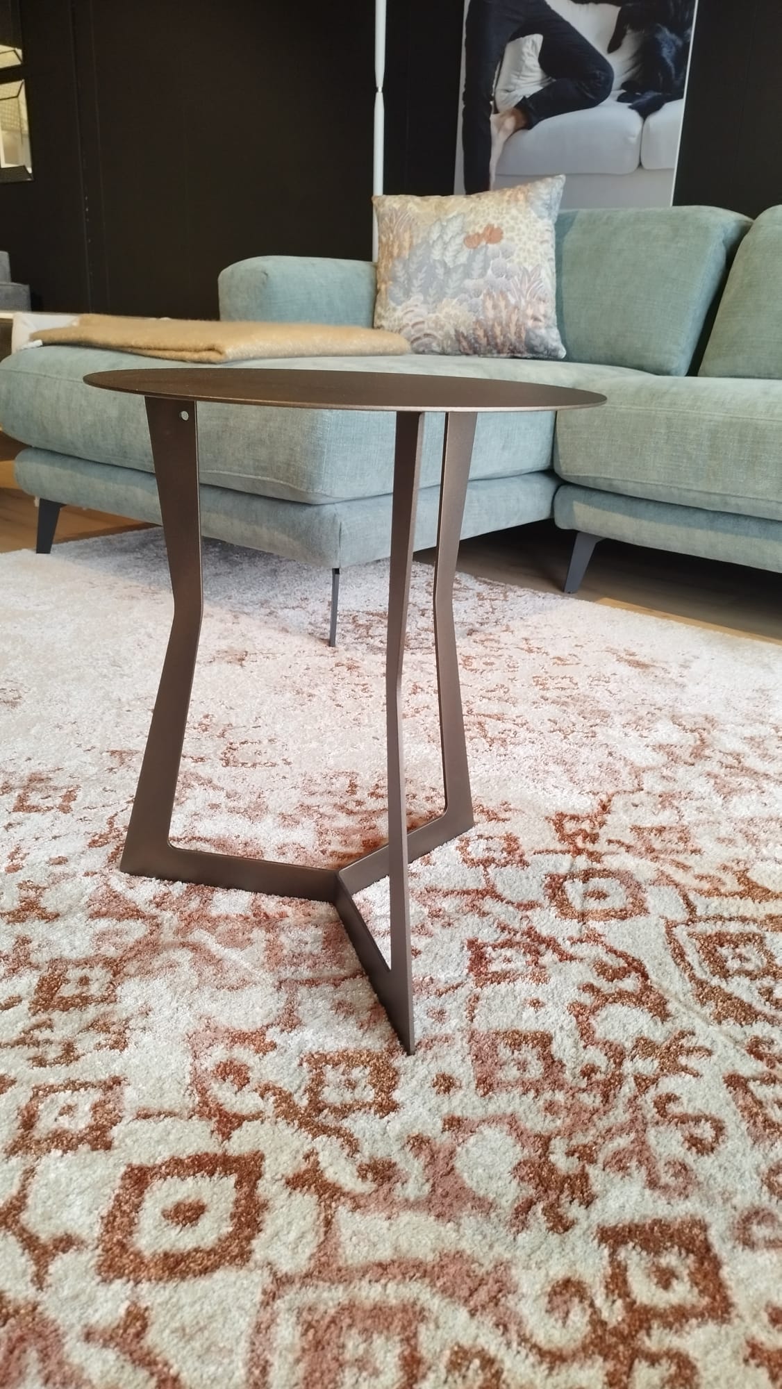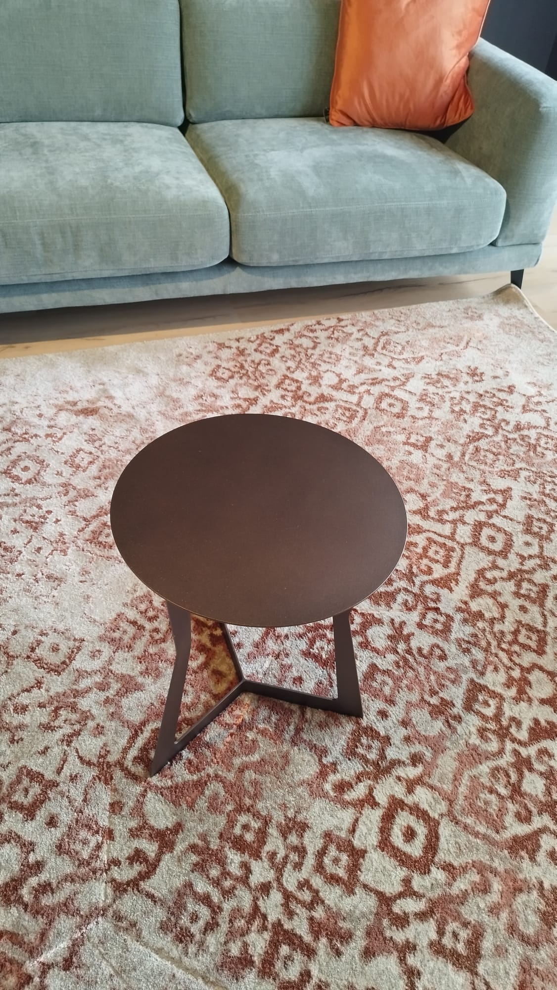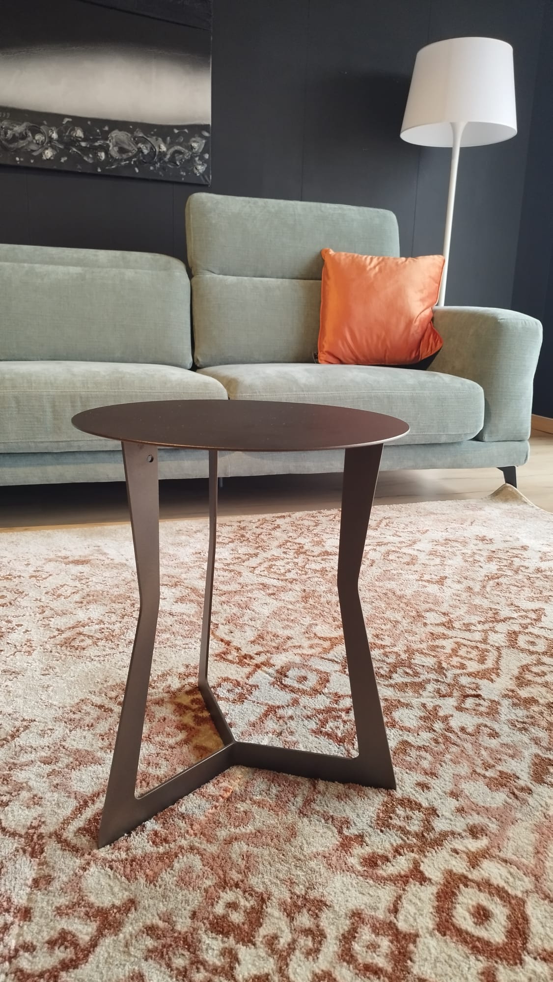 Tavolino in metallo con gambe centrali e piano rotondo adatto da posizionare a lato o al centro del salotto, con verniciatura effetto corten.