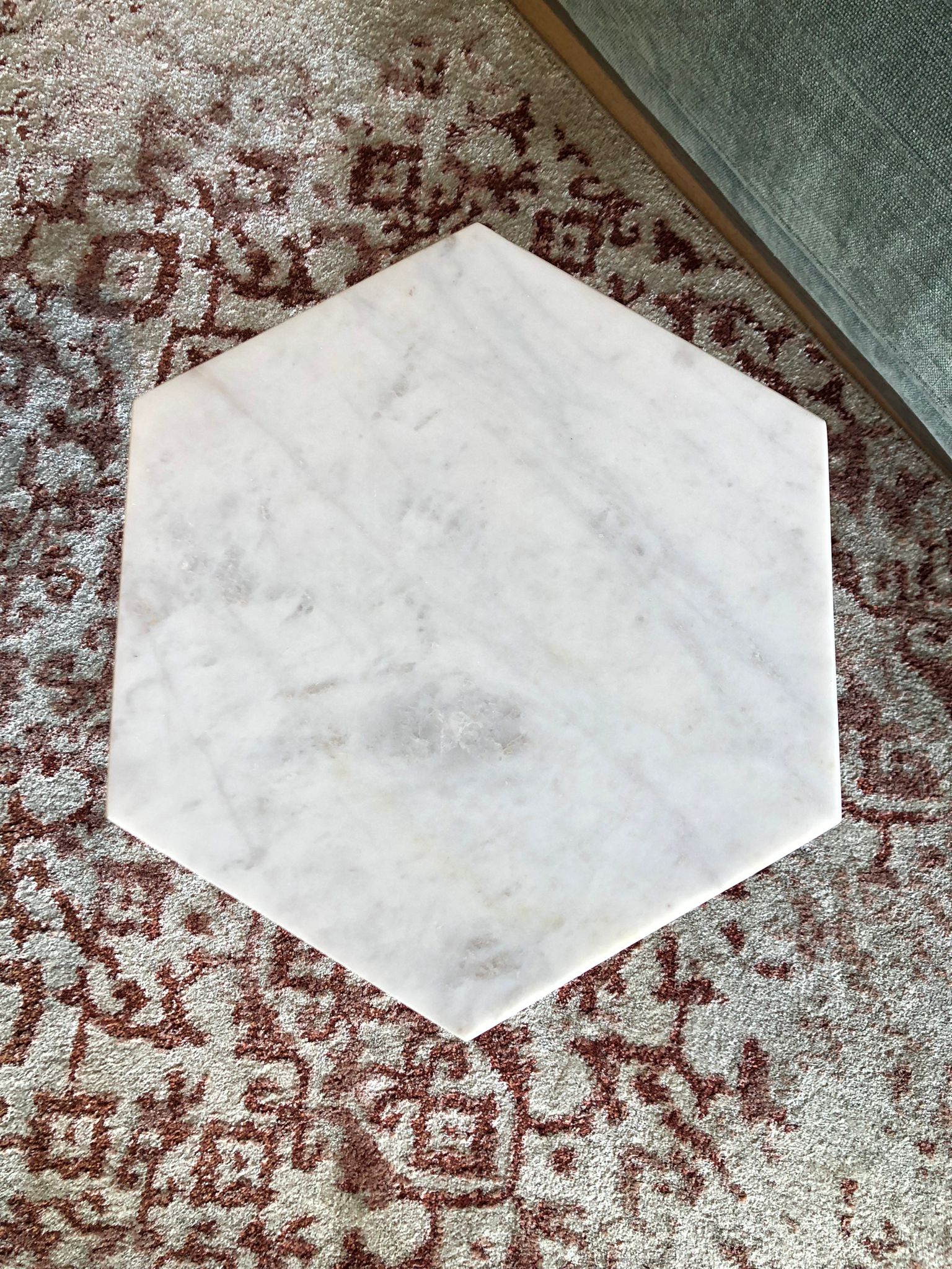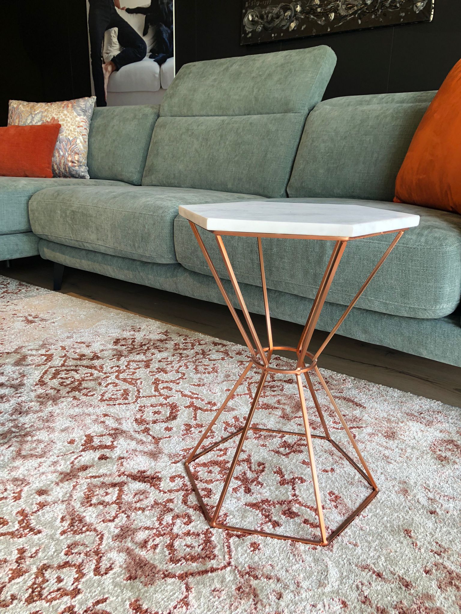 Tavolino dalla forma esagonale con una struttura in metallo rame e un piano effetto marmo venato bianco.