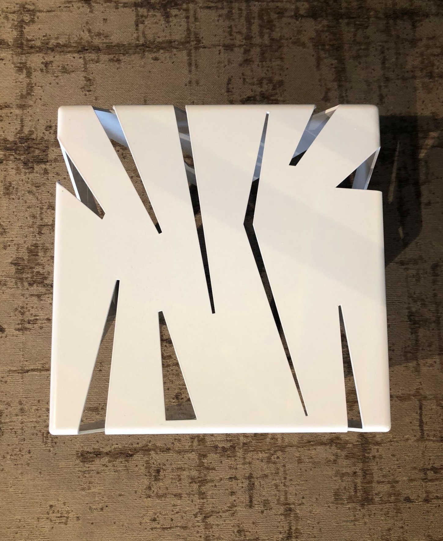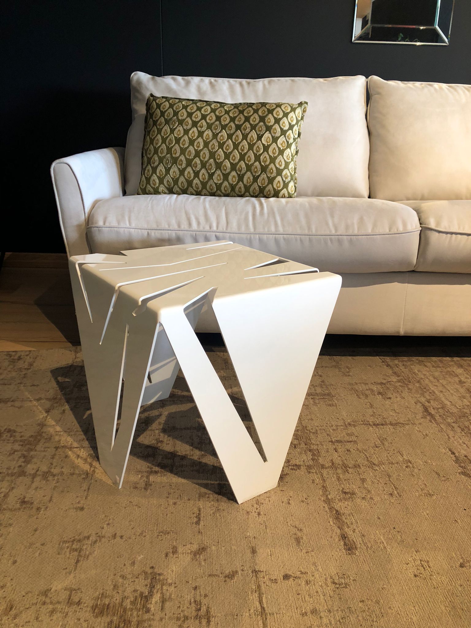 Tavolino dal design unico e ricercato con struttura in acciaio forata da tagli laser che creano un particolare gioco di pieni e vuoti.