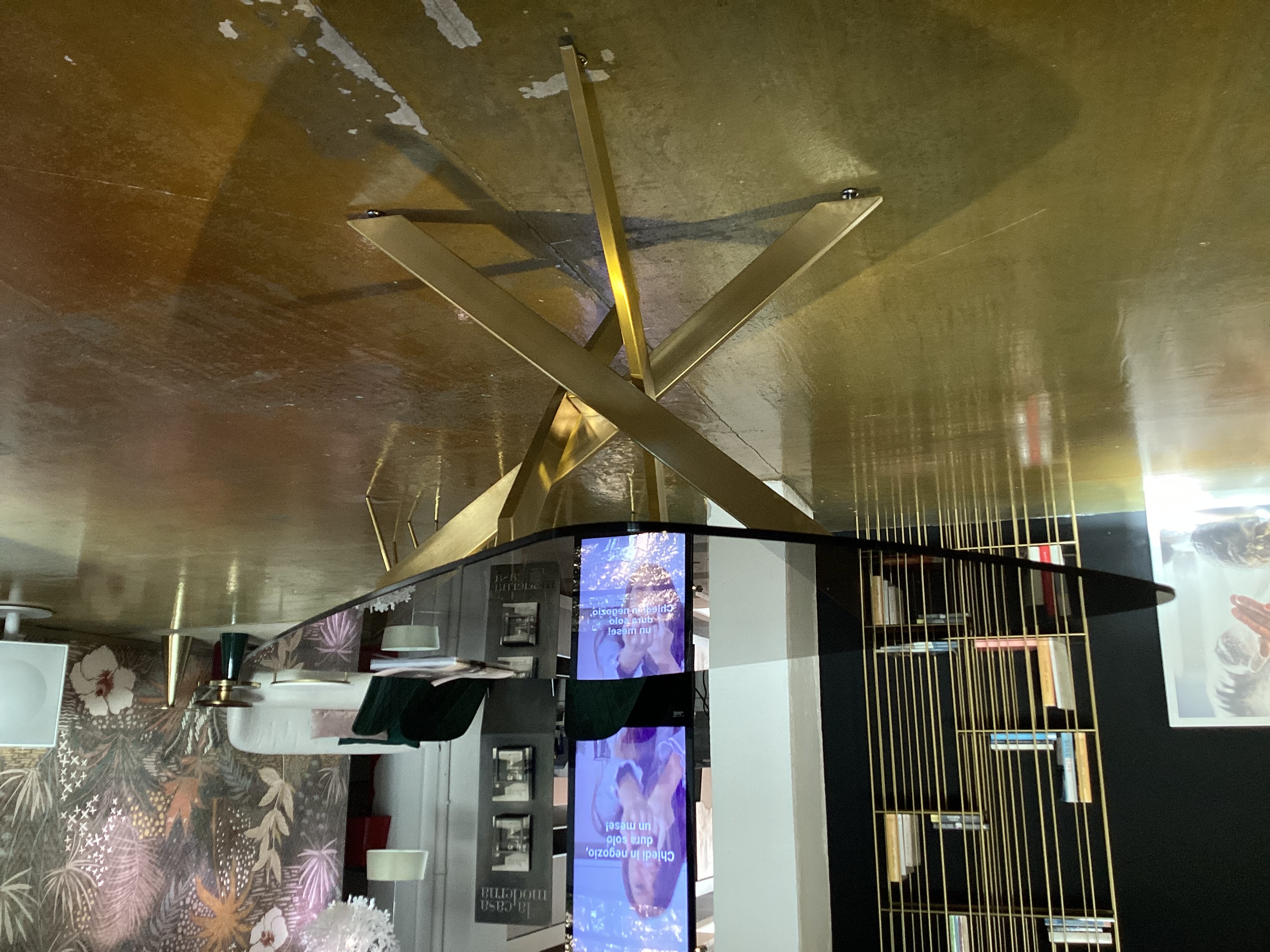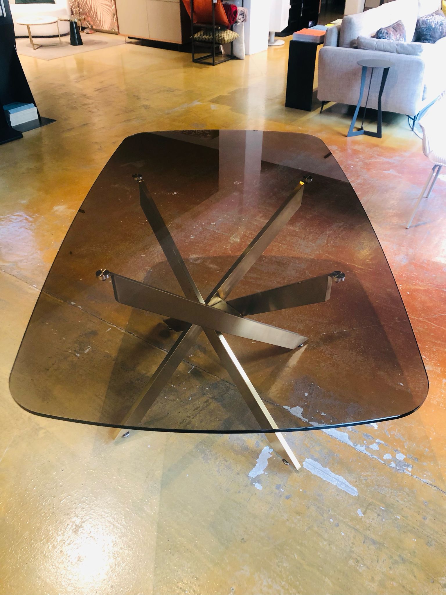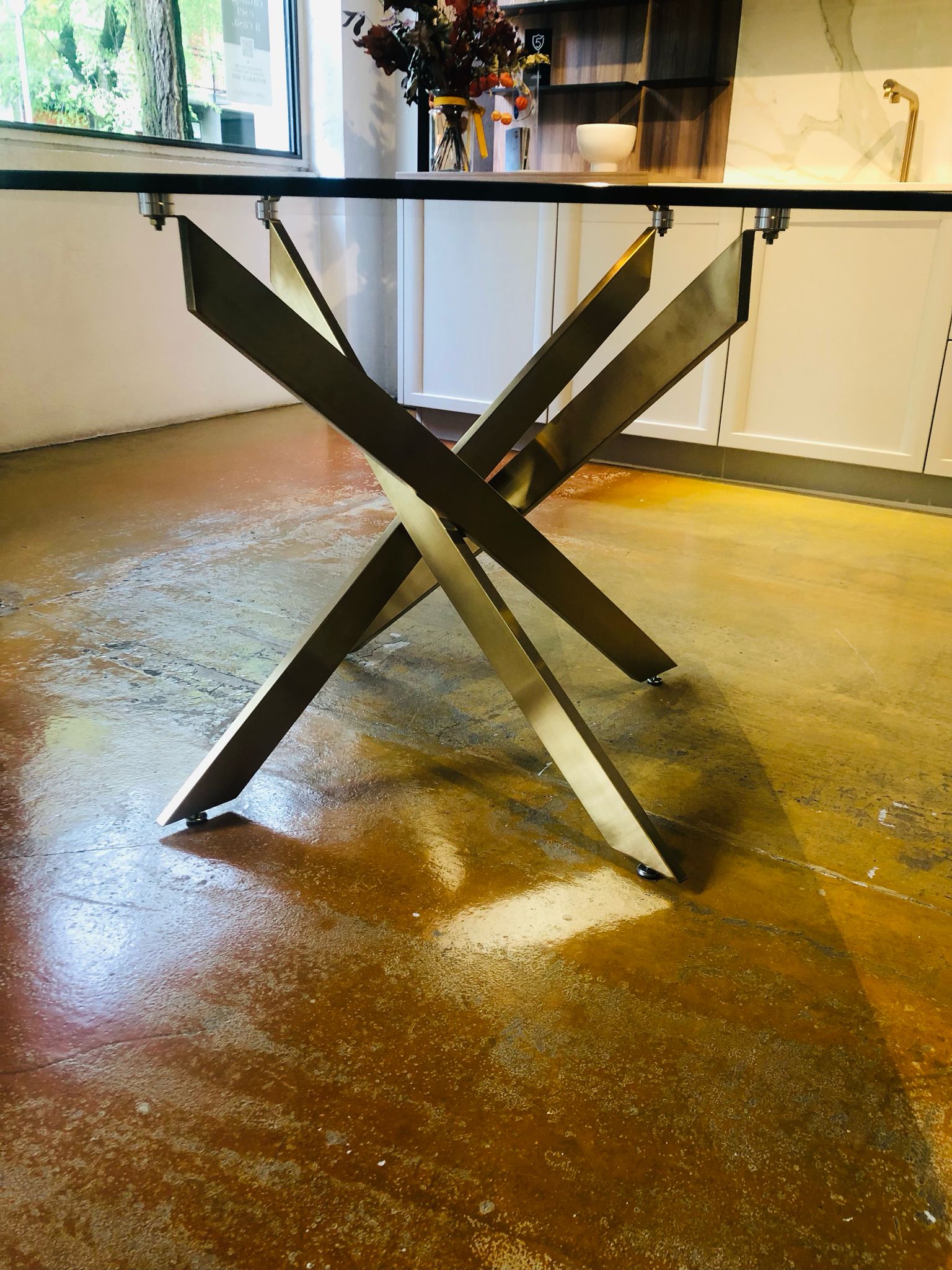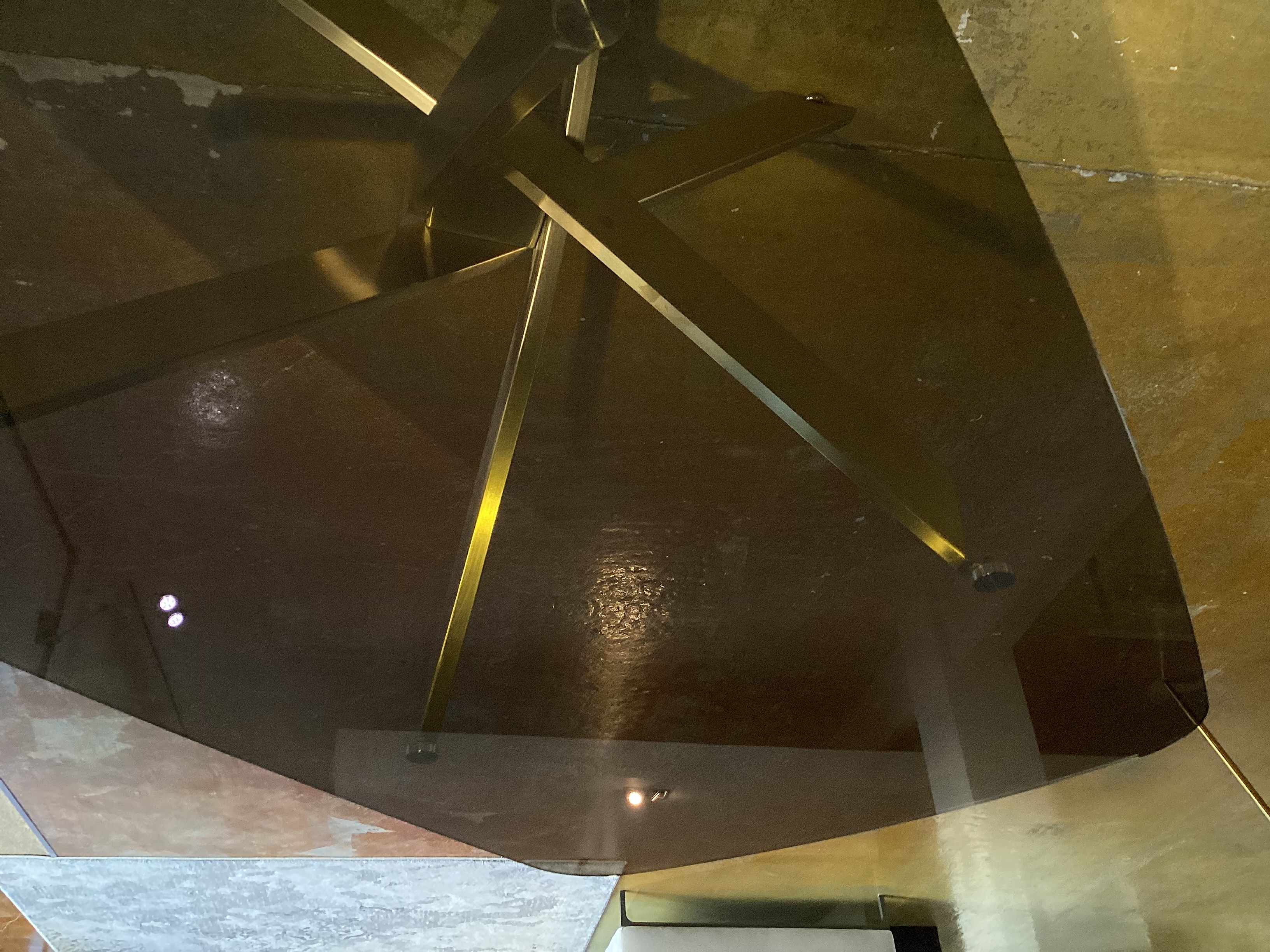 Tavolo in vetro bronzo MyDeko mod. George con angoli raggiati e basamento in metallo oro.