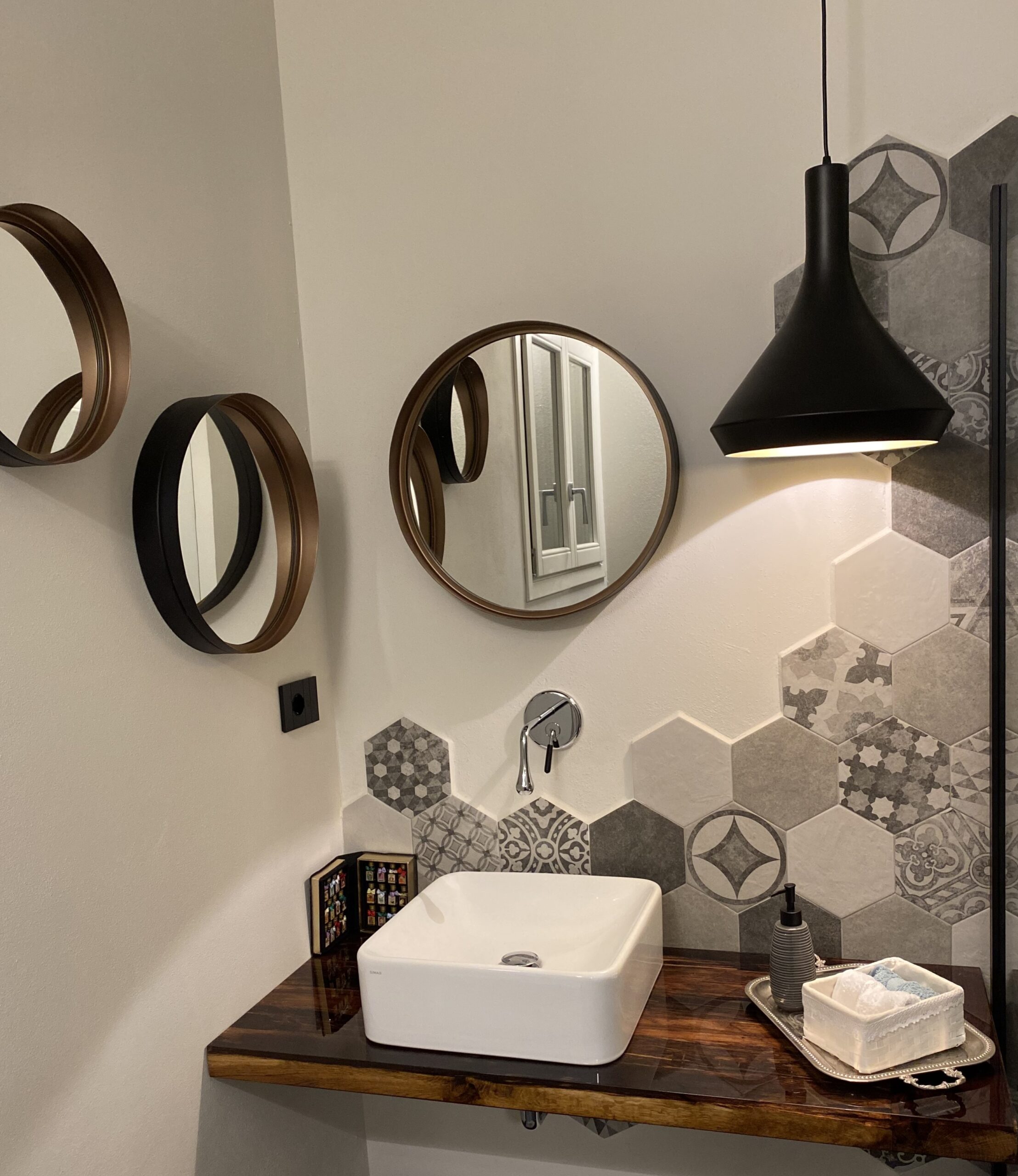I dettagli geometrici caratterizzano questo bagno dove il grigio delle piastrelle incontra la naturalezza del legno, che scalda lo sguardo e rende l’ambiente molto accogliente.