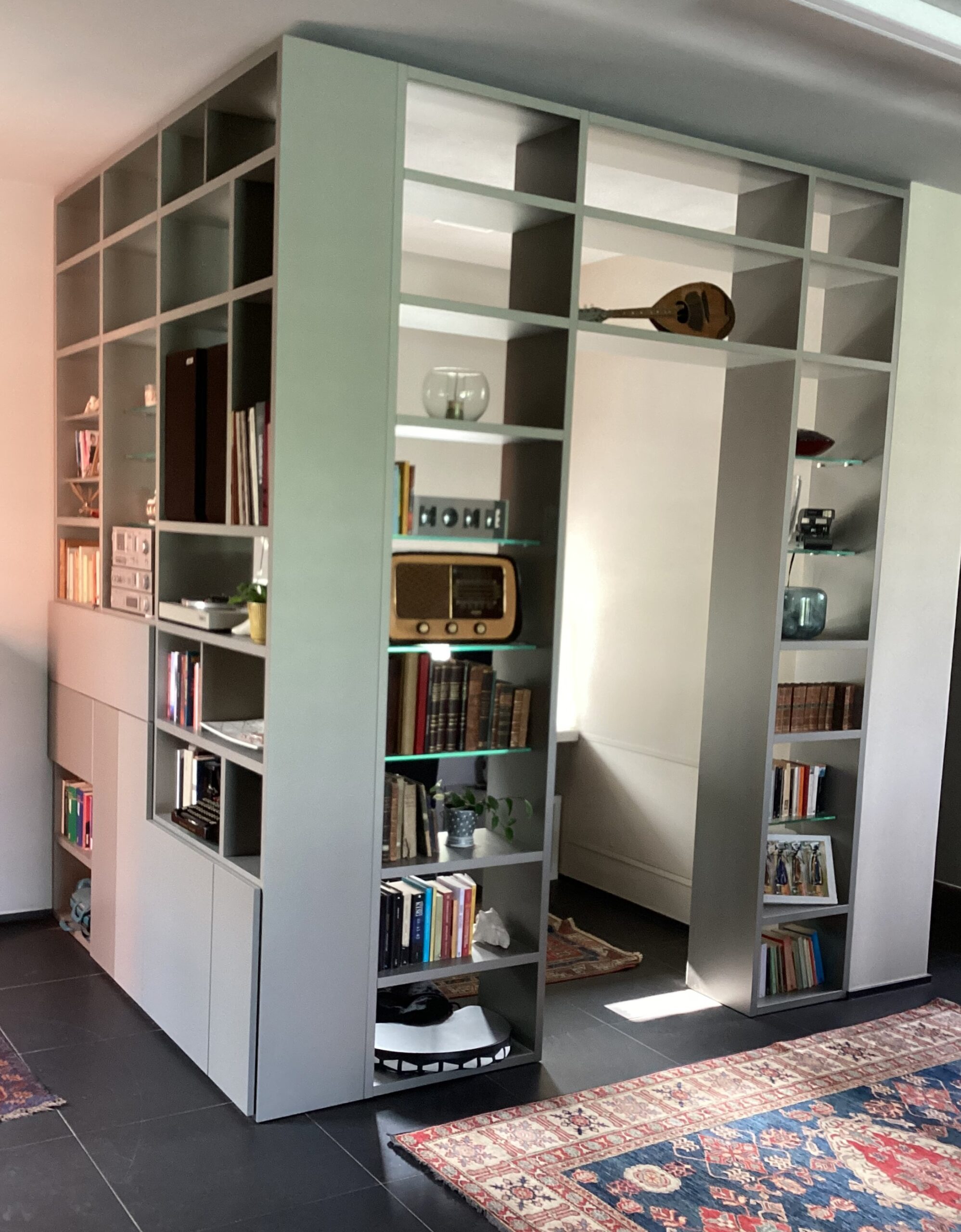 Per rimanere in tema geometrico, nel living troviamo la libreria angolare bifacciale che crea un suggestivo effetto prospettico.