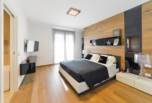 A completare il progetto troviamo una bellissima camera da letto scaldata dai toni del legno. La parete boiserie diventa elemento distintivo, creando un’atmosfera accogliente e sofisticata, perfetta per ritrovare calma e intimità alla fine della giornata.