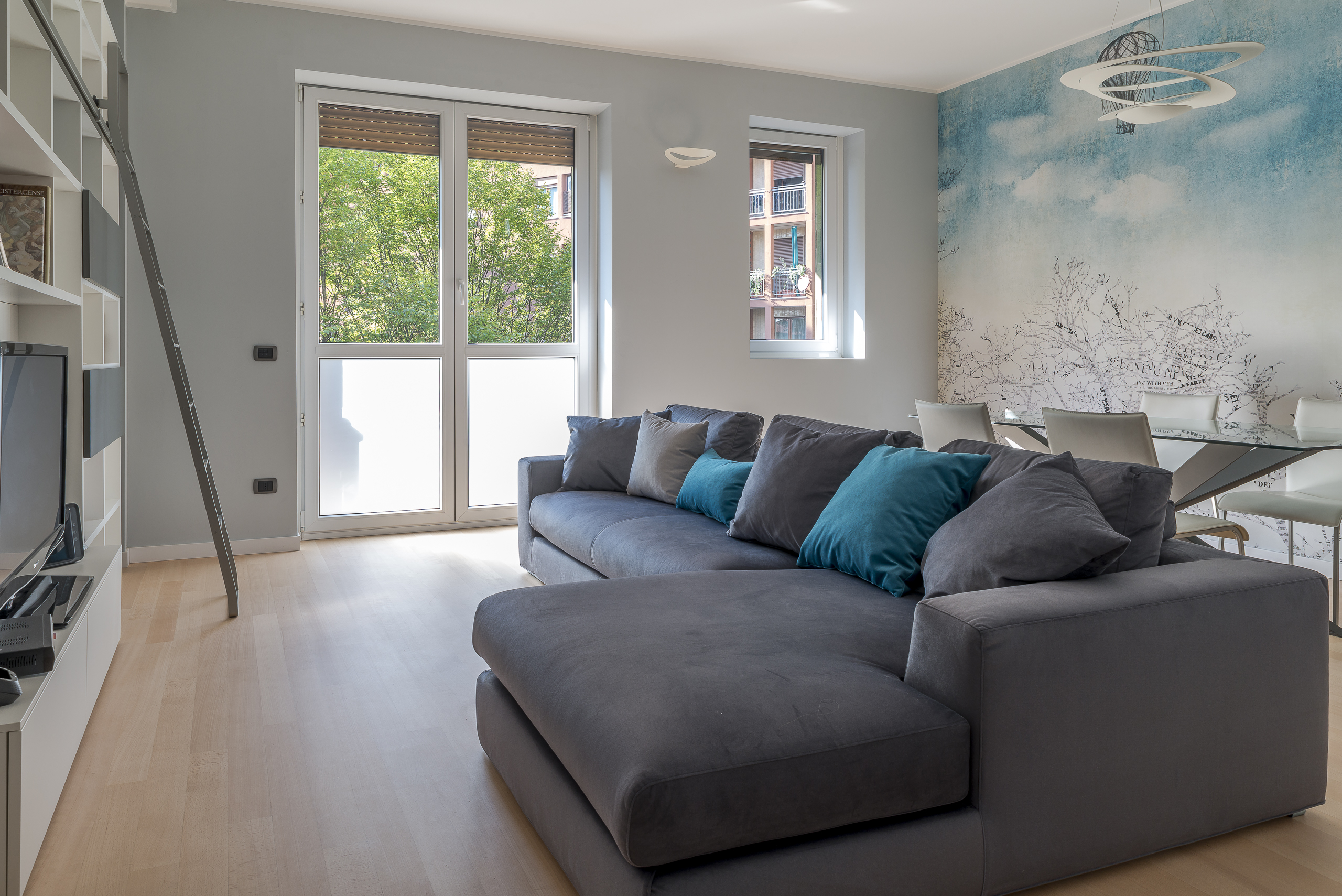 L’ambiente principale è arioso e ben illuminato dalla luce naturale che entra dalle grandi finestre, creando un’atmosfera accogliente e rilassante. Il soggiorno è dominato da un ampio divano dalle linee contemporanee, impreziosito da cuscini dai toni freddi che aggiungono carattere senza appesantire lo spazio. La libreria a tutta altezza, con scala integrata, diventa un elemento architettonico distintivo, pratico e allo stesso tempo scenografico.