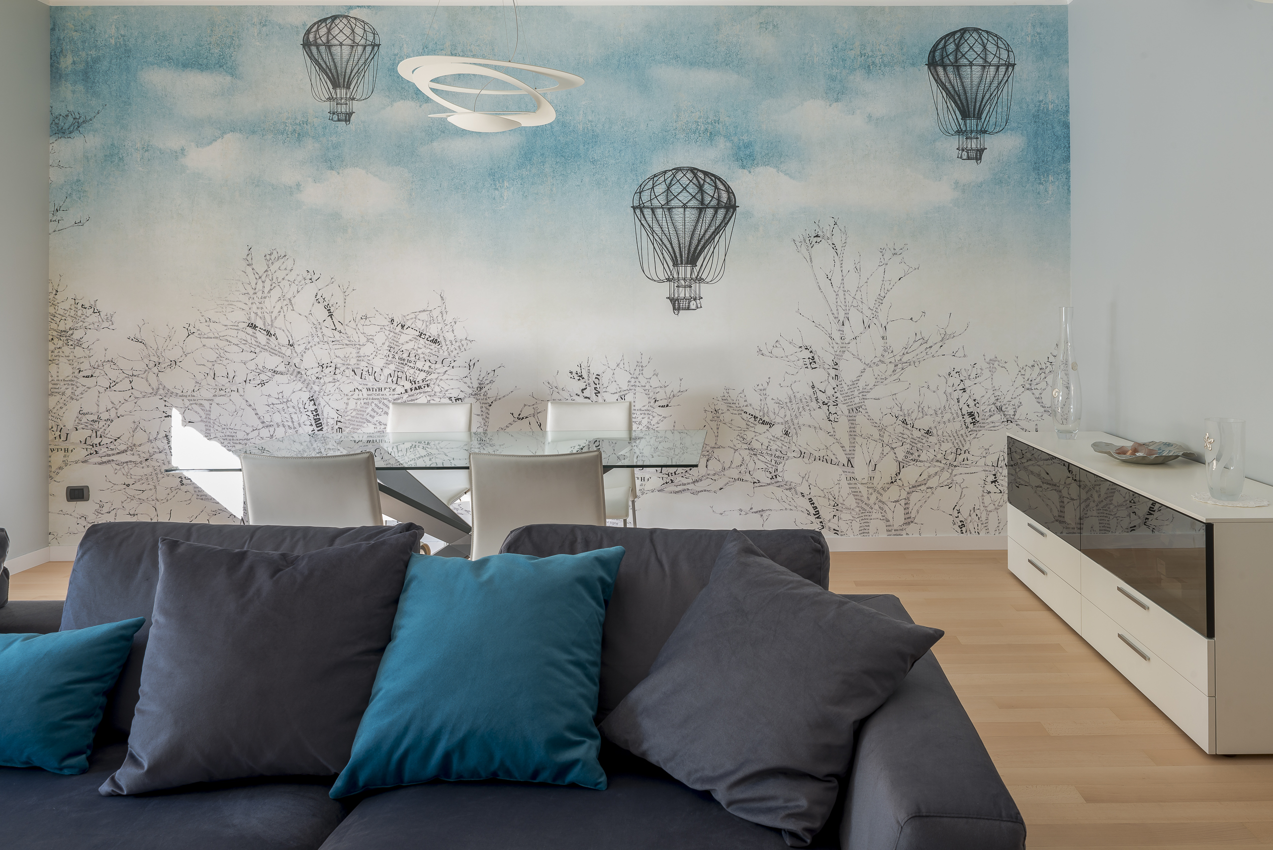La parete decorata con una grafica delicata dona personalità e profondità, mentre l’arredo essenziale mantiene un equilibrio tra comfort e design.