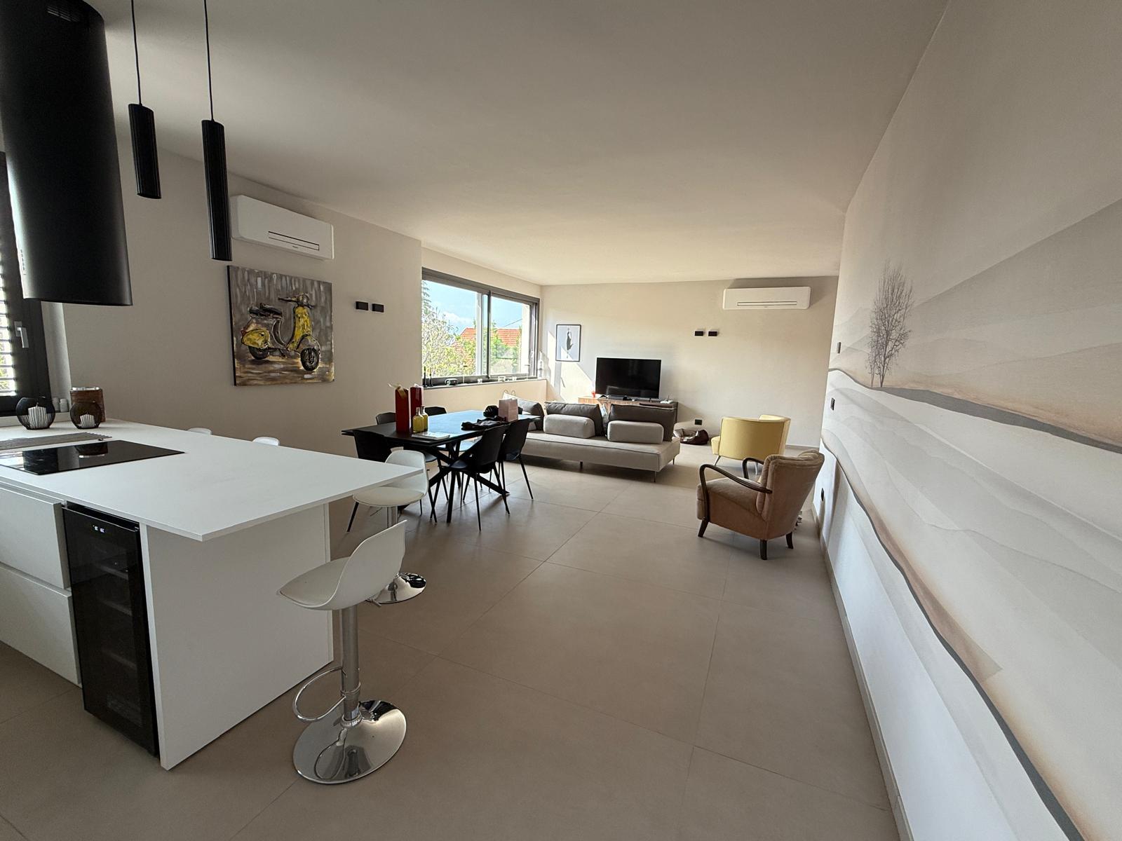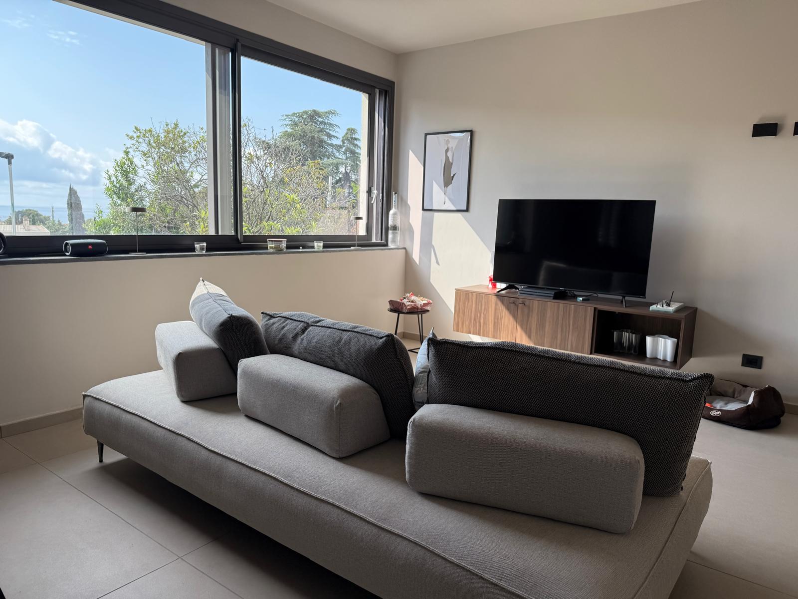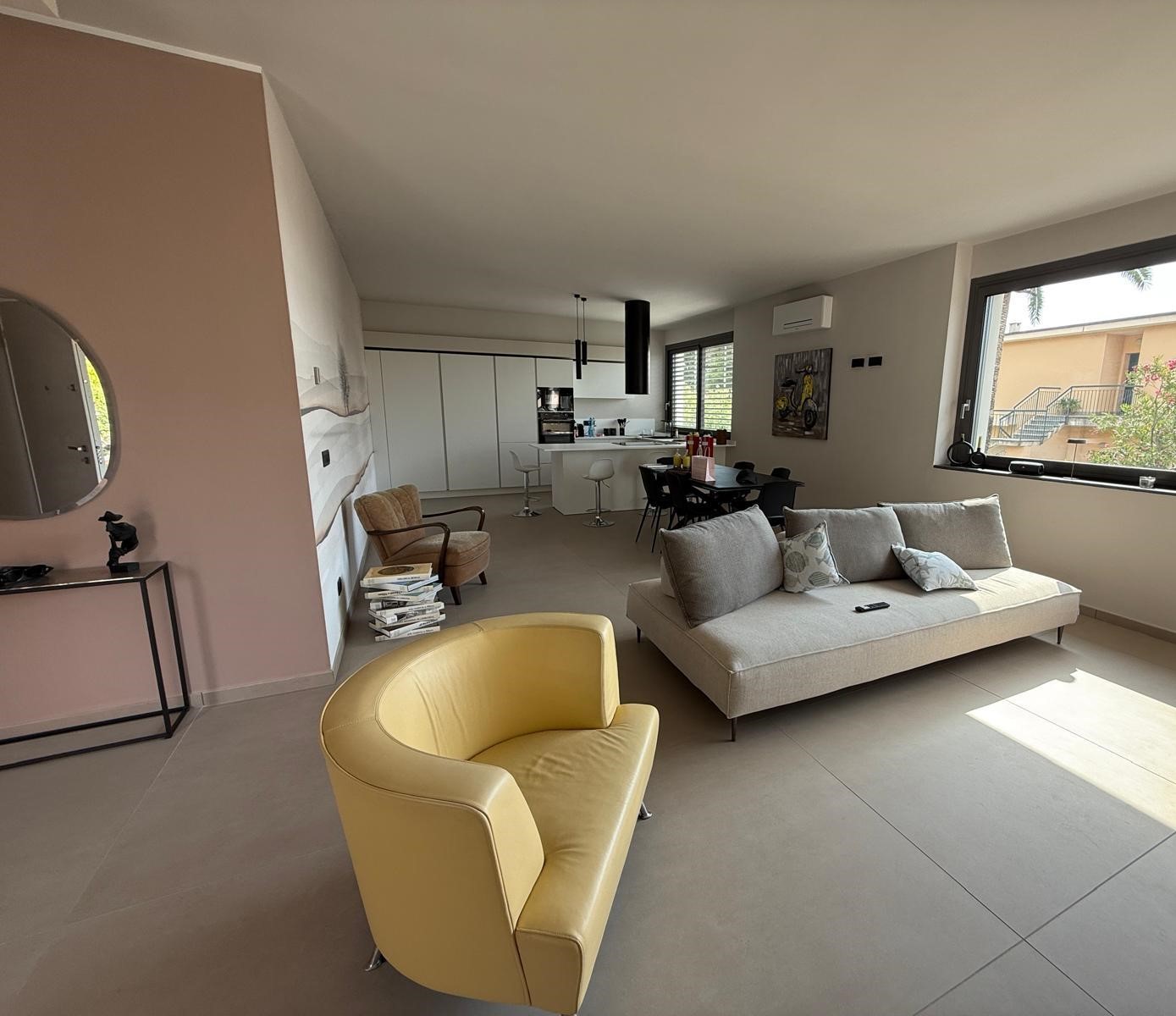 Siamo al mare, la luce naturale entra generosa dalle finestre e scorre sul pavimento chiaro, amplificando la sensazione di ampiezza e ordine.