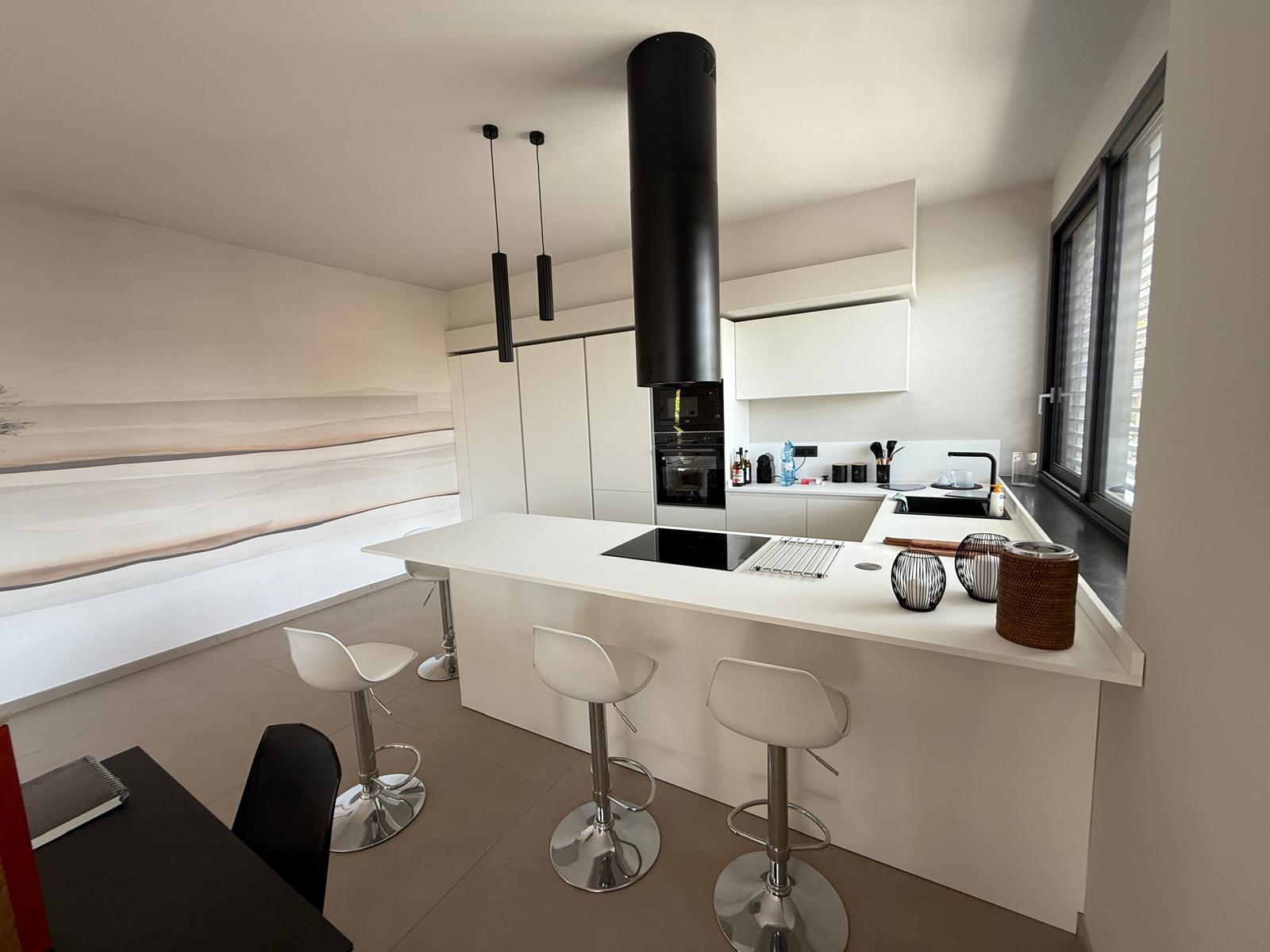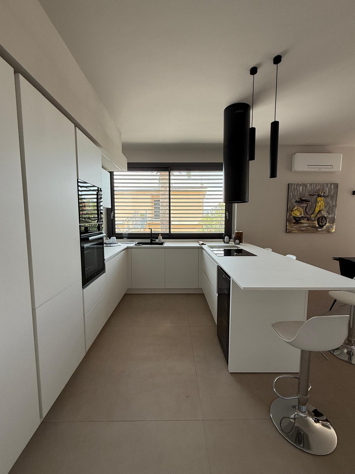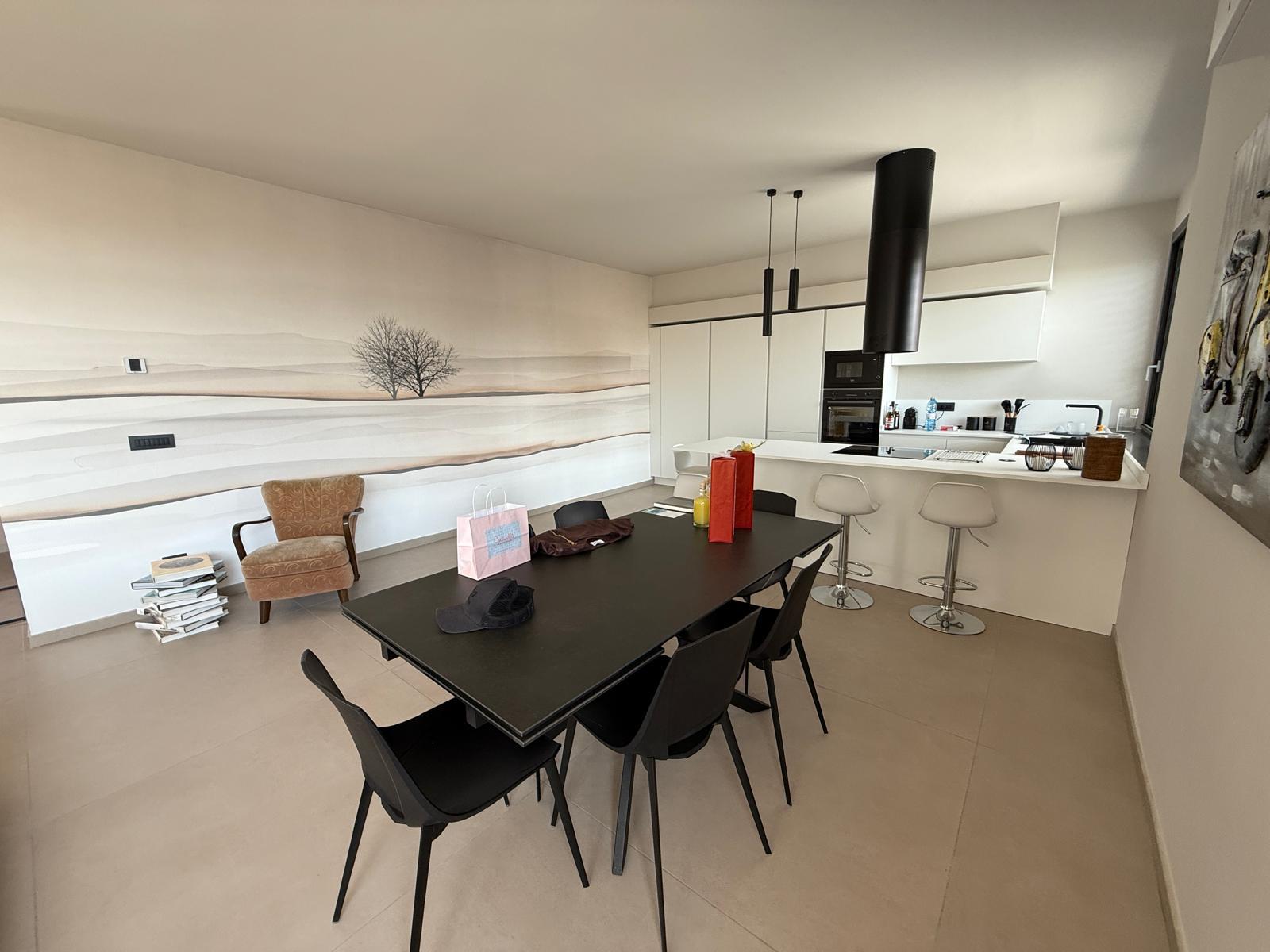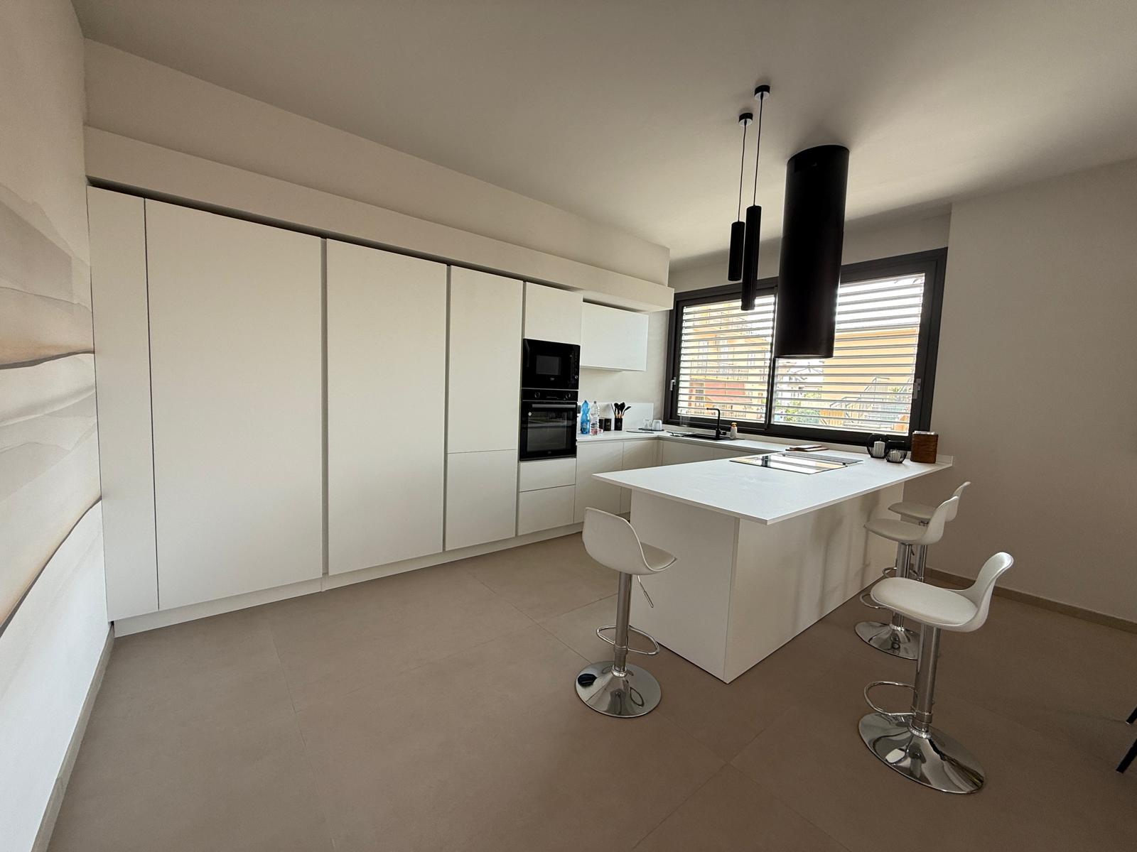La cucina, essenziale e contemporanea, è integrata con eleganza: le superfici pulite e l’isola centrale suggeriscono convivialità e praticità.