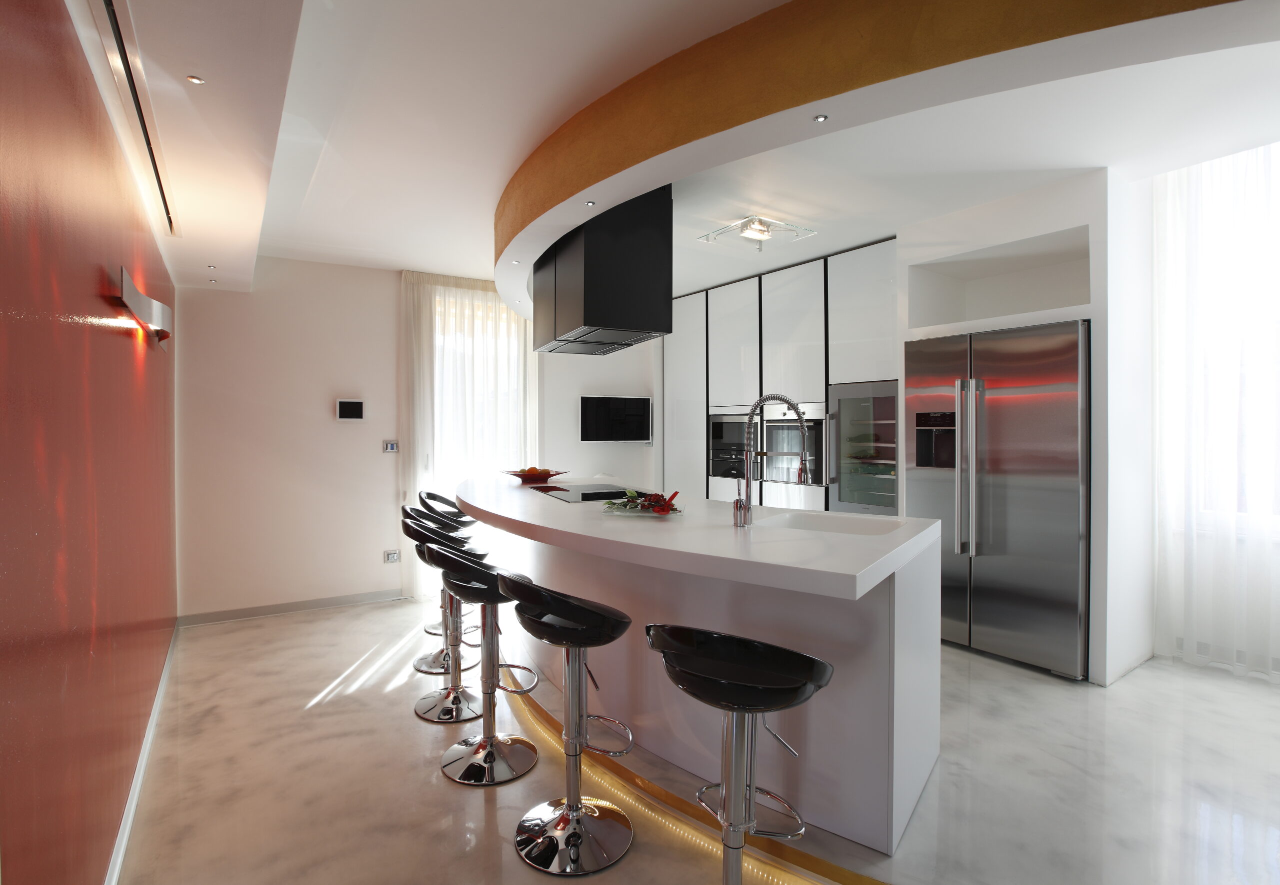 Il cuore del living è il suggestivo lampadario, con pannelli geometrici retroilluminati in tonalità calde che donano profondità e atmosfera. La scala sospesa, con gradini bianchi e balaustra in vetro, diventa un vero elemento scultoreo, contribuendo a un senso di leggerezza e continuità visiva.