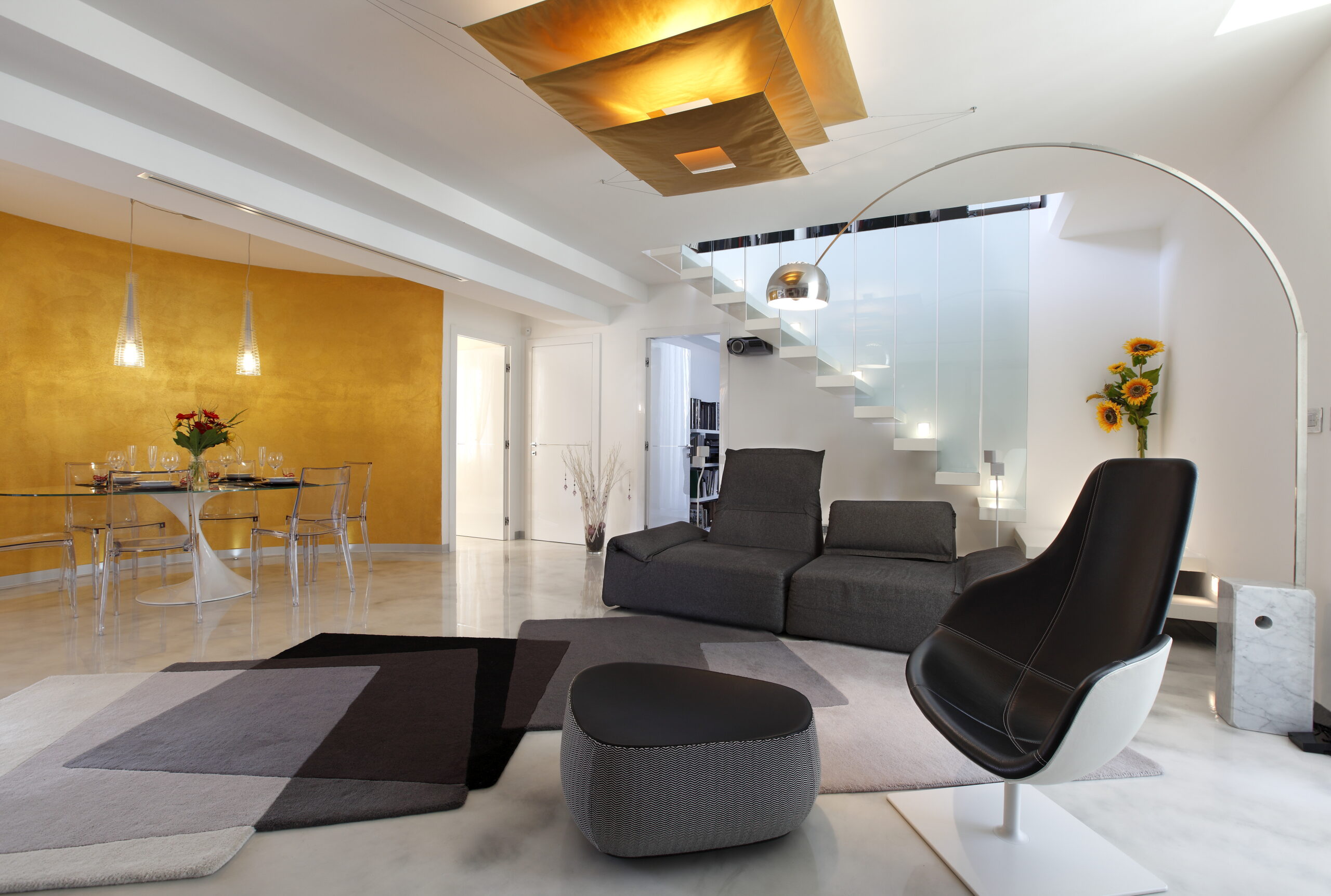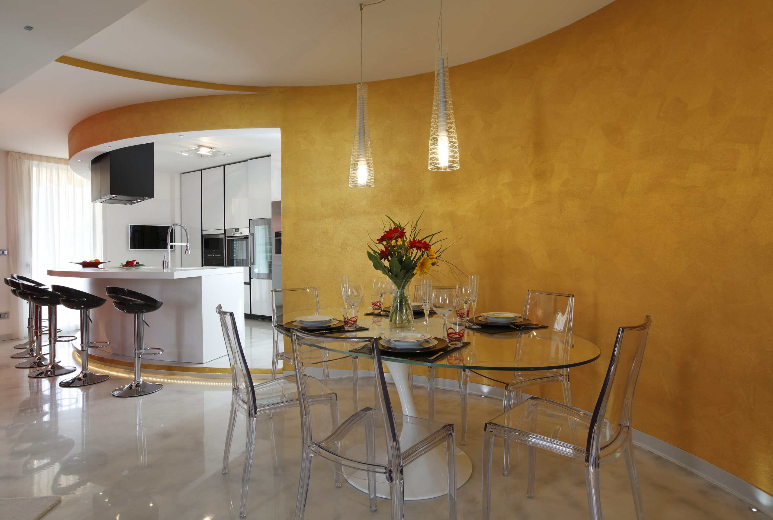 .L’iconica lampada ad arco aggiunge un tocco di sofisticata modernità e il color oro sulla parete di fondo rende l’ambiente ancora più ricercato.